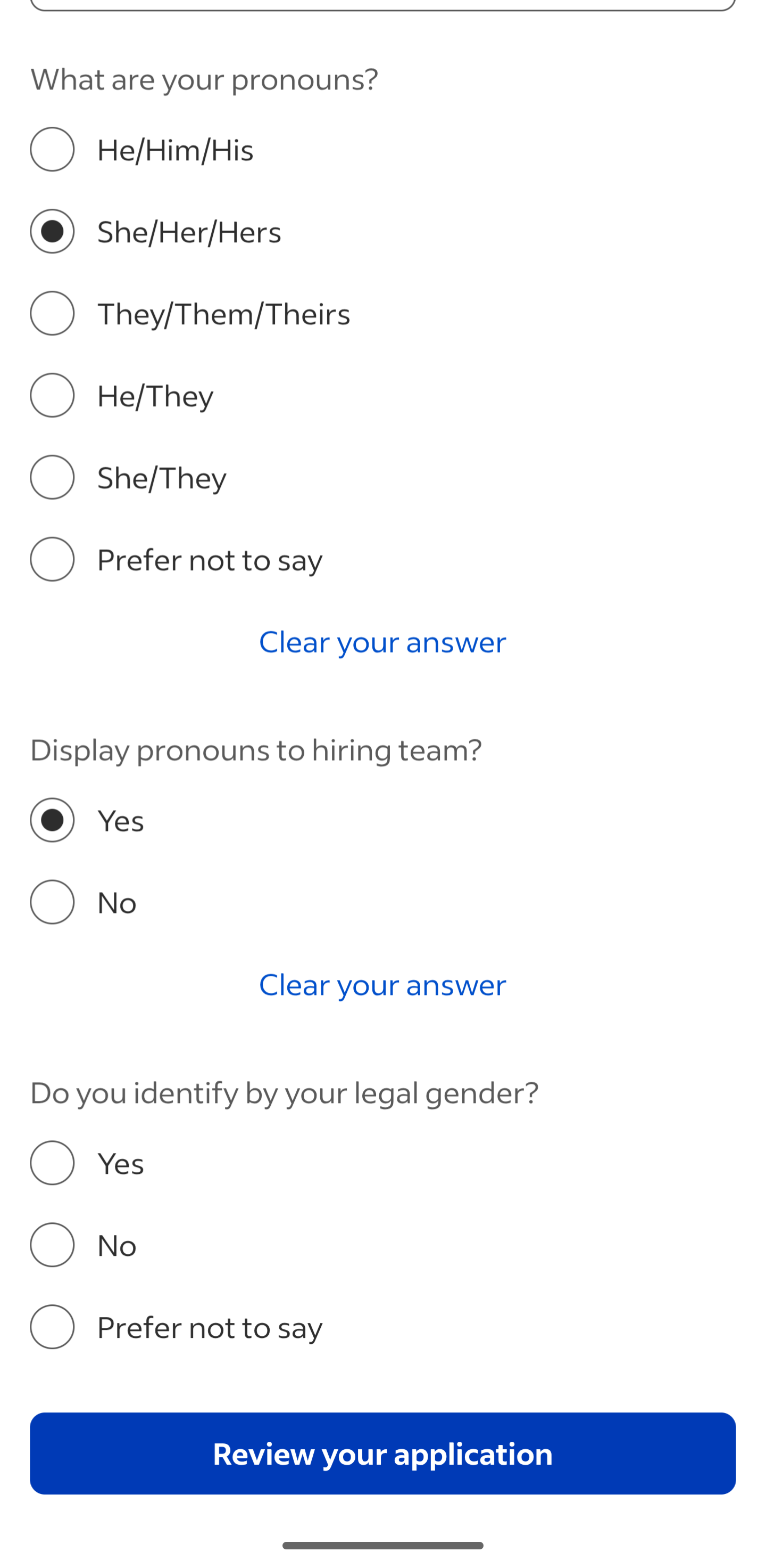 one of my trans friends, who is looking for a job, sent me this screenshot this morning and asked me what I thought about these questions - position is a remote job in TX, for a company based in IN