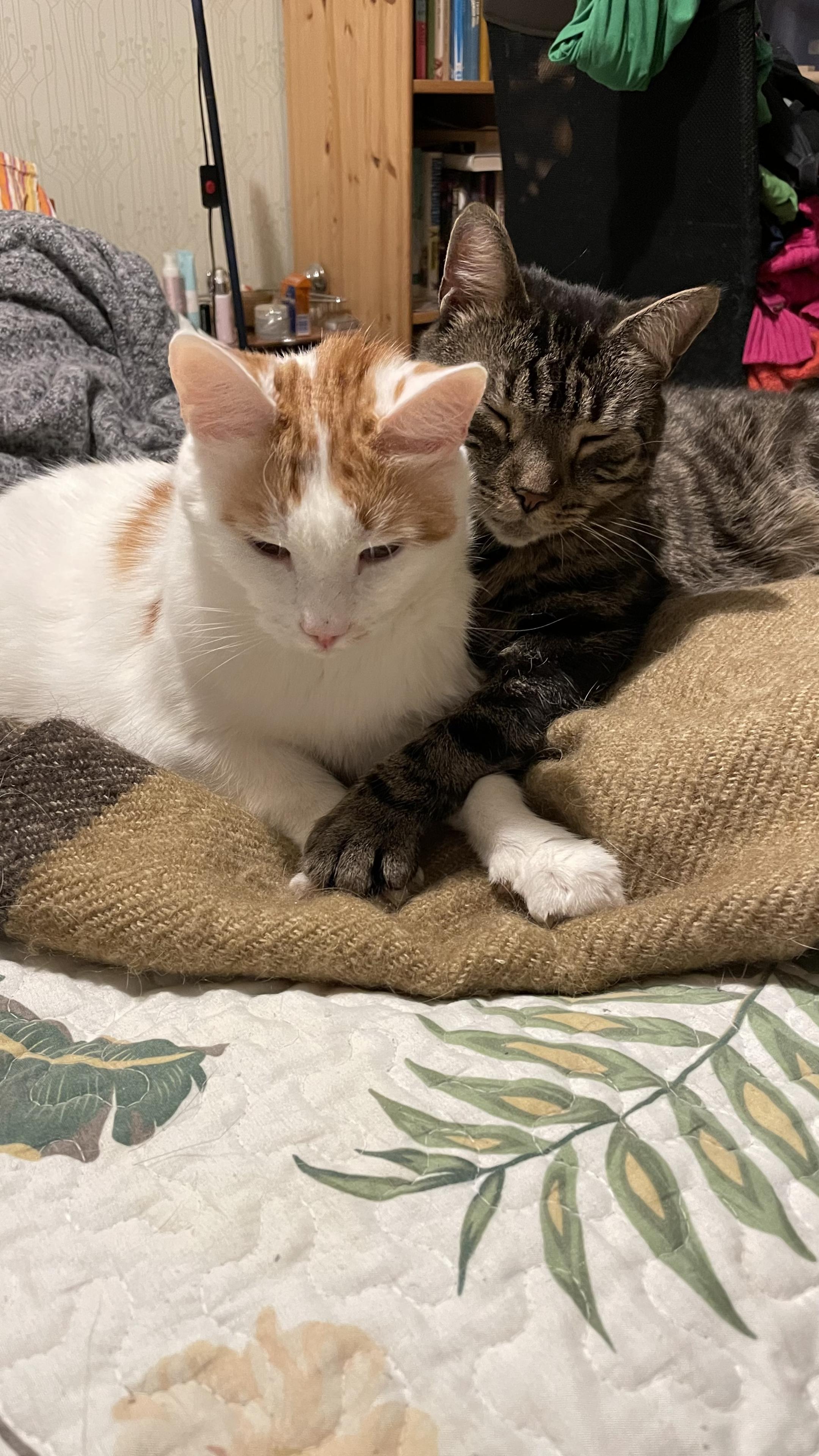 Ystävänpäiväkuvassa Jami ja Ville. Kuva tältä illalta, Jami oli ensin sylikissana ja tohkeissaan pudotti pöydältä tavaraa. Herra Jami pelkää kolinaa, joten Jami juoksi Villen luo turvaan. ”Minä suojelen sinua kaikelta” tuntuu Ville sanovan, tassu Jamin etutassujen ympärillä. #caturday #kissantai #fedicats #adoptdontshop #catsofmastodon