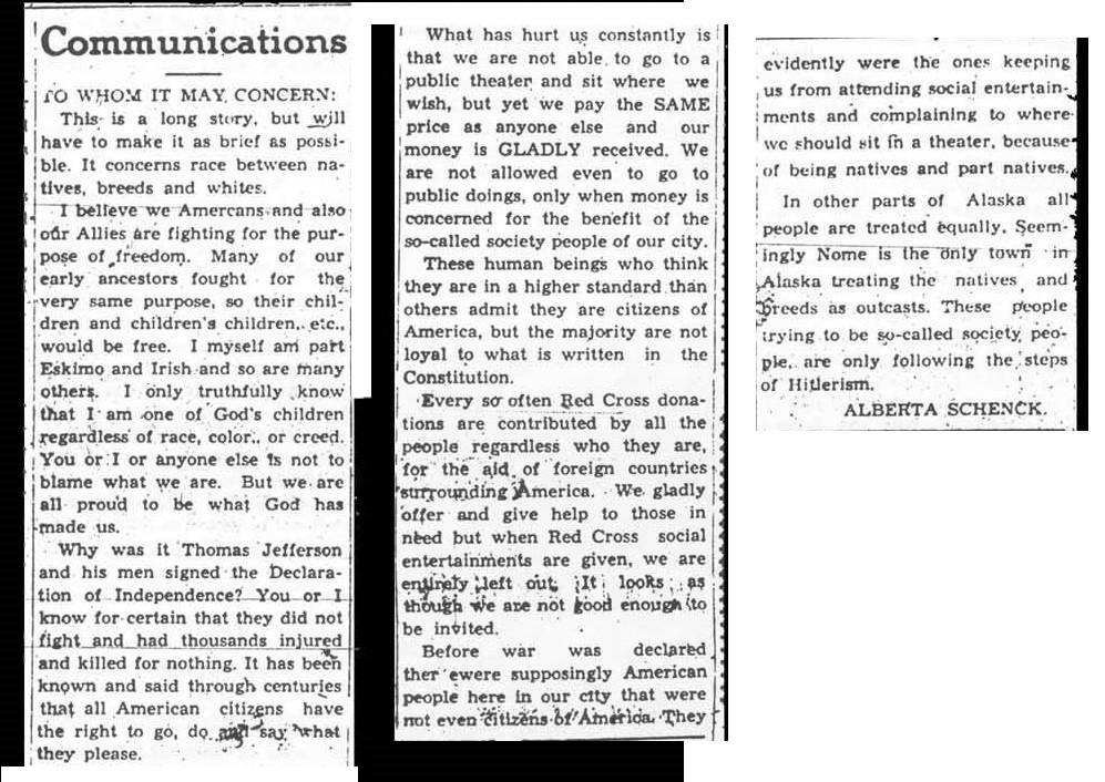 March 3, 1944 Inupiaq 15 y/o Alberta Schenck's letter in Nome Nugget complaining of discrimination at Nome's Dream Theater.