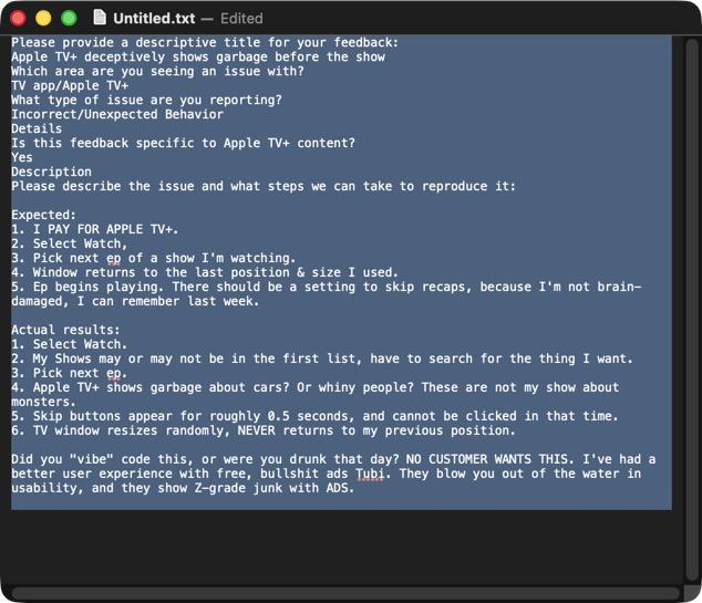 @mdhughes Describe the problem: Your UX is actively user hostileWorkaround: I’m actively torrenting your shit.