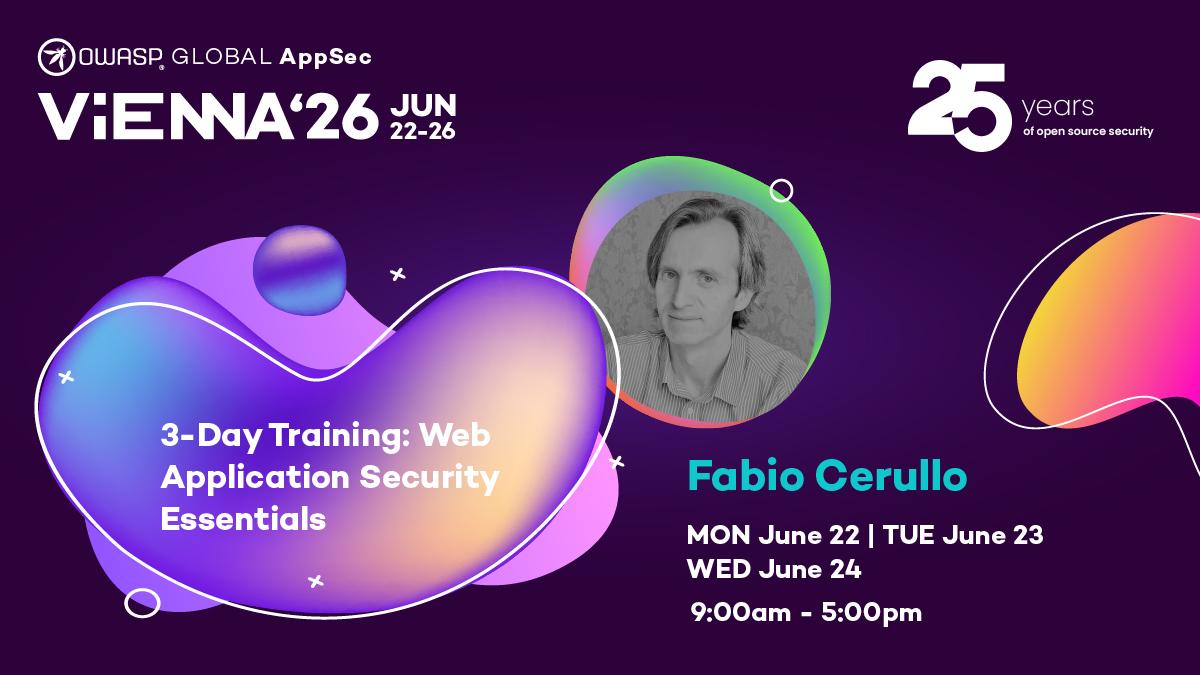 Join Fabio Cerullo’s 3-Day Web App Security Essentials training ⚔️Exploit real vulnerabilities, understand OWASP Top 10 (2025), and tackle modern risks like AI-generated code, all in hands-on labs.https://owaspglobalappseceuvienna20.sched.com/event/2EBUO