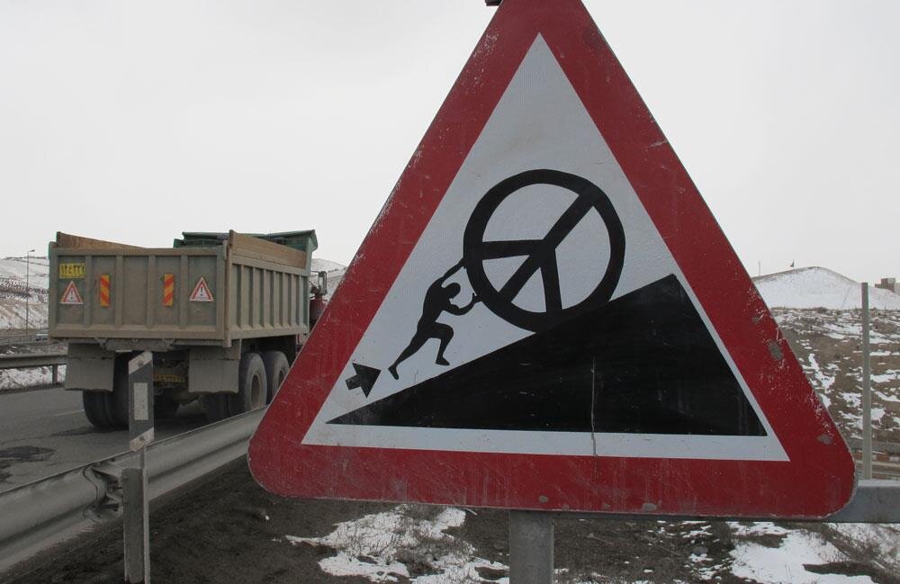 'Pushing Peace Uphil', great and thought provoking streetart in Iran, by Iranian brothers ICY & SOT
