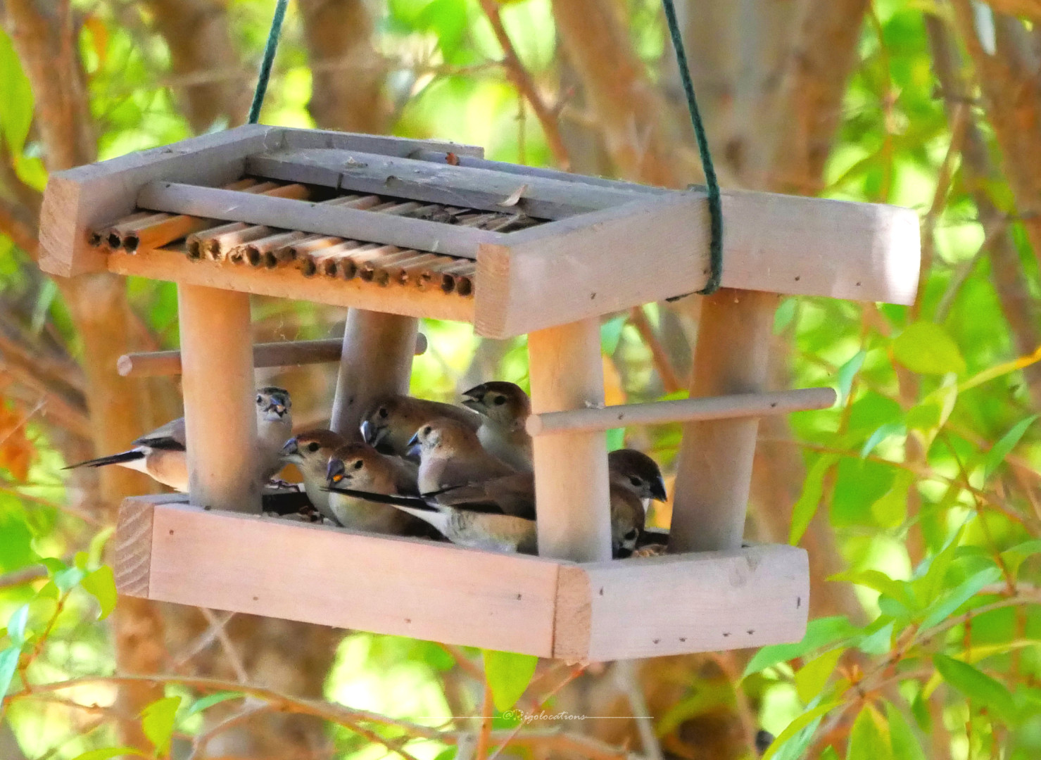 The blue sky reflected in the background sky contrasted with the barn red of the deck railing, combined with some interesting big shapes and diagonals add interest to this photo of a house finch devouring bird seeds.