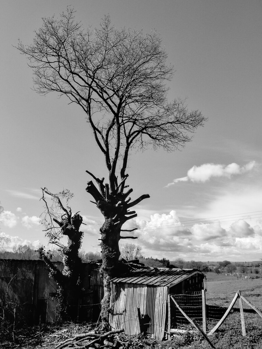 A blackbird sings behind an abandoned fire station and a crow sits on the trumpet.#blackandwhitephotos #monochromemarch