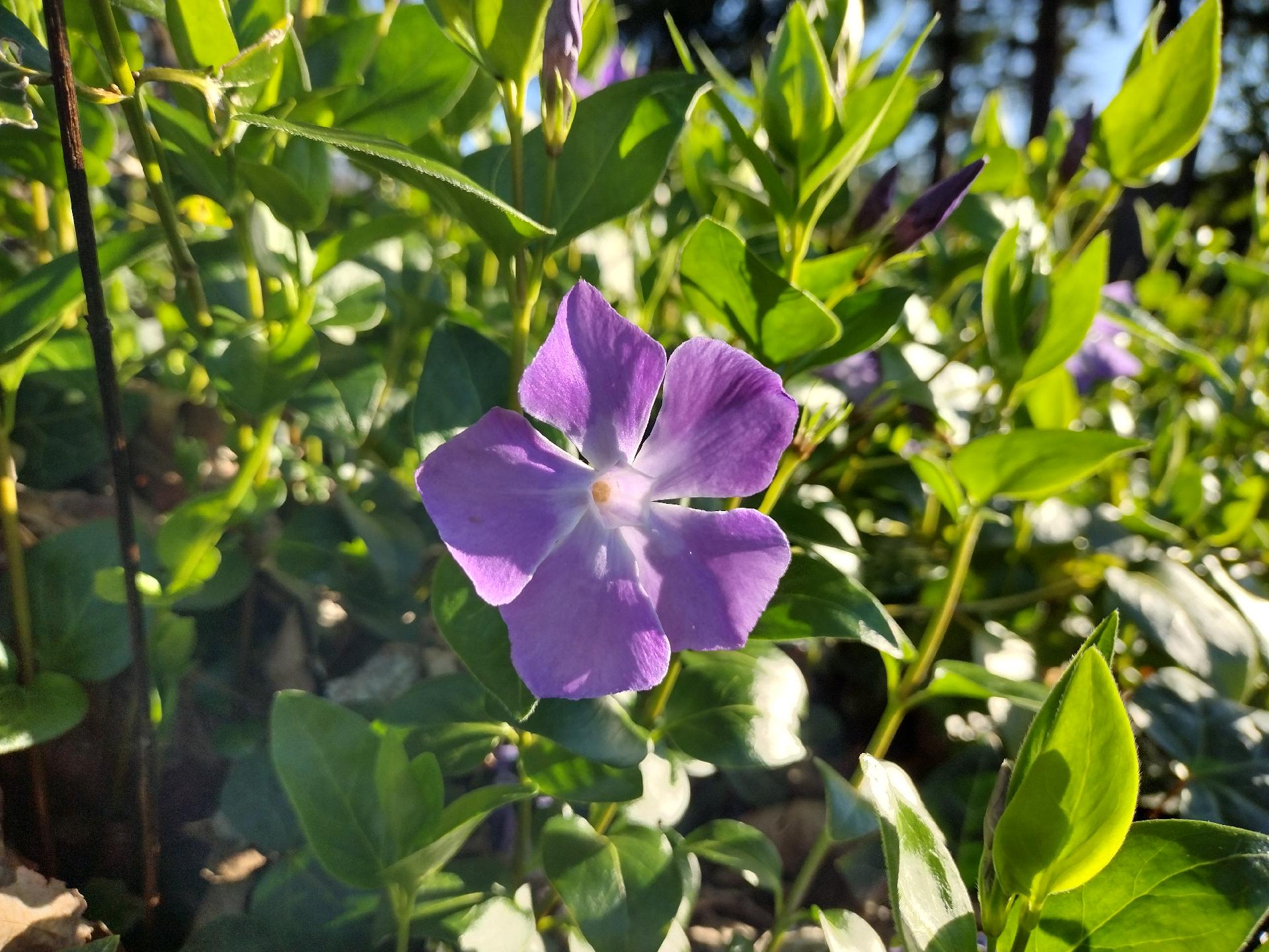 Weedy but pretty cranesbill in a park lawn, and another viburnum species in the shrubbery.