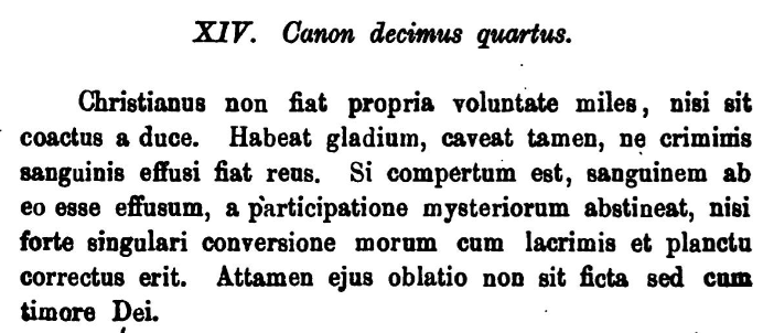 I love the detect text feature in Mastodon. I just used it to quickly translate this bit of latin to English.This is an interesting bit of Christian history... this is from a document called “Canons of Hippolytus” dated around 340 ad, and it basically says that Christians should not be soldiers. And if they are, it should only be if they were forced, and even so they should not take another life or the will not be allowed to partake in communion (the mysteries).I'd be curious what you all think of this? Certainly doesn't fit with most Evangelical Christian theological perspectives today. Most Christians would across the spectrum of denominations would probably disagree with this... so are we right today or were we more right back then about how to deal with soldiers/military?XIV. Canon fourteenA Christian shall not become a soldier of his own free will, unless he is compelled by a leader. Let him have a sword, but let him be careful not to become guilty of the crime of shedding blood. If it is discovered that blood has been shed by him, let him abstain from partaking of the mysteries, unless perhaps he will be corrected by a singular conversion of manners with tears and lamentation. Nevertheless, his offering shall not be feigned, but out of the fear of God.#Theology #BiblicalStudies #Christianity #Christian