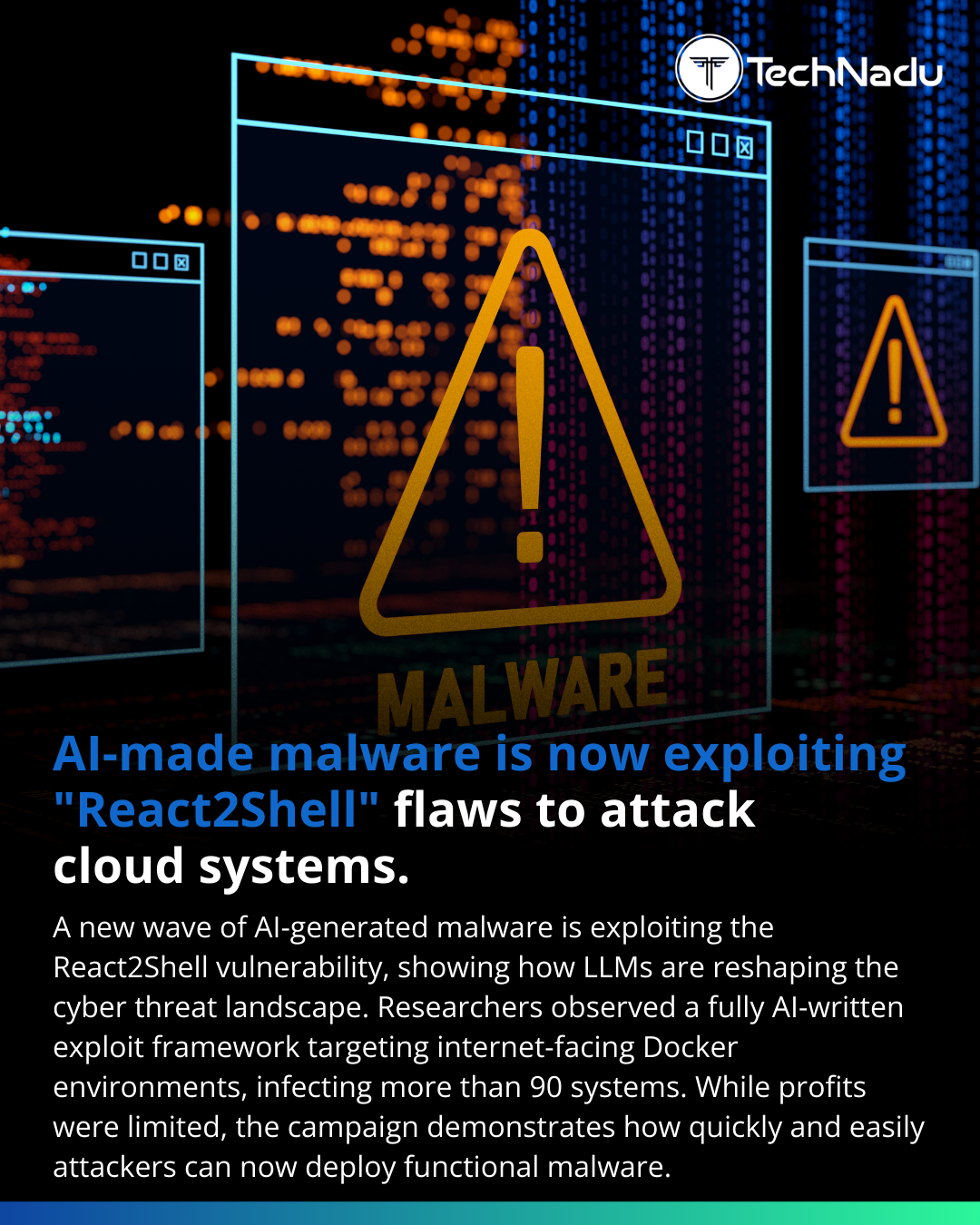 AI-generated malware exploiting React2Shell highlights how LLMs are accelerating cloud-focused attacks.90+ Docker hosts infected with minimal effort.https://www.technadu.com/ai-generated-malware-exploits-react2shell-vulnerability-as-llm-assisted-cyberattacks-target-cloud-infrastructure/619771/#Infosec #AIThreats #CloudSecurity #Malware