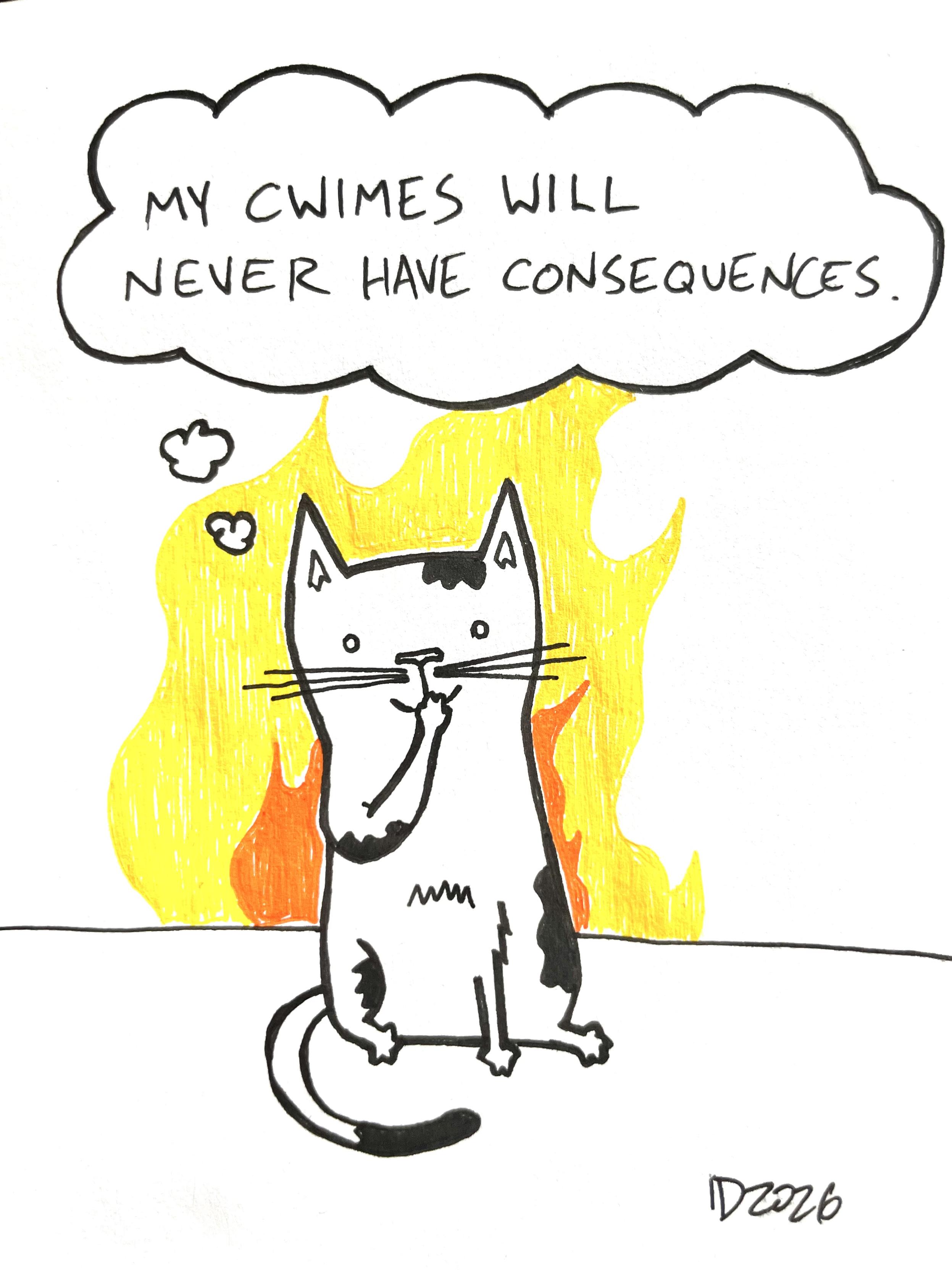 good morning, enjoy a crime cat.#TheCrimeCats say have you considered that being flammable makes getting set on fire your fault?consider supporting http://ko-fi.com/thecrimecats #comic #comics #ComicStrip #DailyComic #IndieComic #WebComic #cat #cats #crime #anarchy #anticapitalism #antifascism