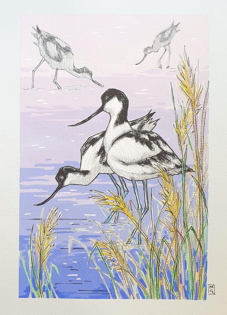 The Avocet is a distinctively-patterned black and white wader with a long up-curved beak.