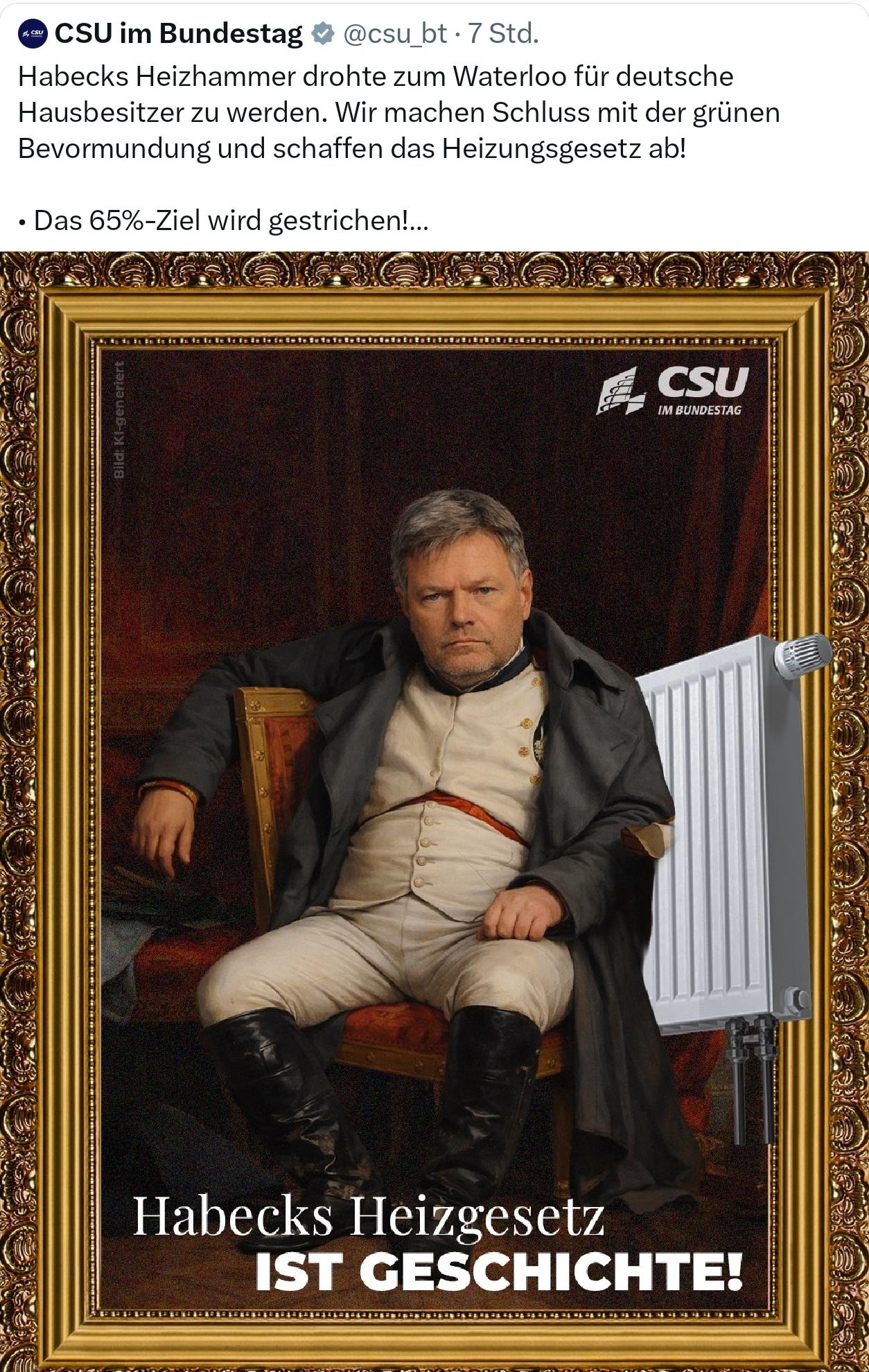 @hart das Bild ist zugegebenrmaßen " witzig". Noch witziger ist, dass ausgerechnet die Partei das Bild veröffentlicht, deren Vorsitzender im Gegensatz zu Robert Habeck keine Sekunde zögern würde, sich zurück halten könnte, sich selbst zum Kaiser zu krönen. Hätte er denn die Gelegenheit.