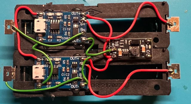 Die Pufferbatterie ist fertig, über das Solarpanel mit integrierter 6000mAh Batterie wird dann das Ding hier geladen mit zwei 21700er Akkus. Die beiden Ladeboards regulieren die maximale Spannung individuell (balancing) und machen bei >= 3A Verbrauch dicht. Die Nistkastenkamera verbraucht mit IR LEDs in etwa 260mAh, das ließe sich sicherlich auch noch etwas optimieren. Sollte dann auch mindestens 2x2500mAh on-top geben, also 5000mAh (die 6000 sind Quark) + 2x2500mAh = 10000mAh / 260mAh = 38,46h Gucken, ob das so passt mit der Ladeleistung dann, um alles wieder voll zu bekommen.Nachher nochmal alles in Sprühvaseline️ (CorrosionX HD) baden und dann kann das verschifft werden.#diyelectronics