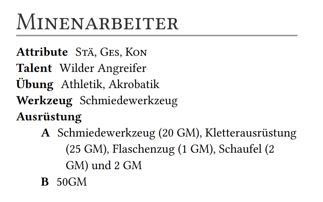 Diesen Hintergrund habe ich aus dem SRD erstellt.Hintergrund: MinenarbeiterAttribute: Stä, Ges, KonTalent: Wilder AngreiferÜbung: Athletik, AkrobatikWerkzeug: SchmiedewerkzeugAusrüstung:A: Schmiedewerkzeug (20 GM), Kletterausrüstung (25 GM), Flaschenzug (1 GM), Schaufel (2 GM) und 2 GMB: 50GMWas meint ihr?#dnd #pnpde