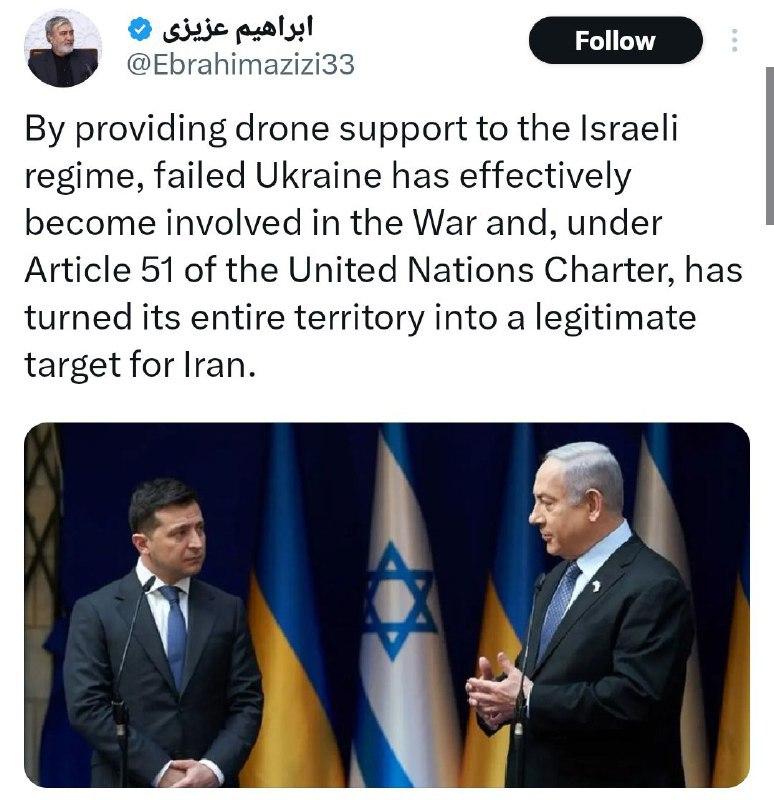 ⚡️Zelensky’s #drone support to #Israel means 'FAILED #Ukraine' effectively involved in war, turned its ENTIRE territory into 'LEGITIMATE target for #Iran' Iranian Parliament’s Nat.