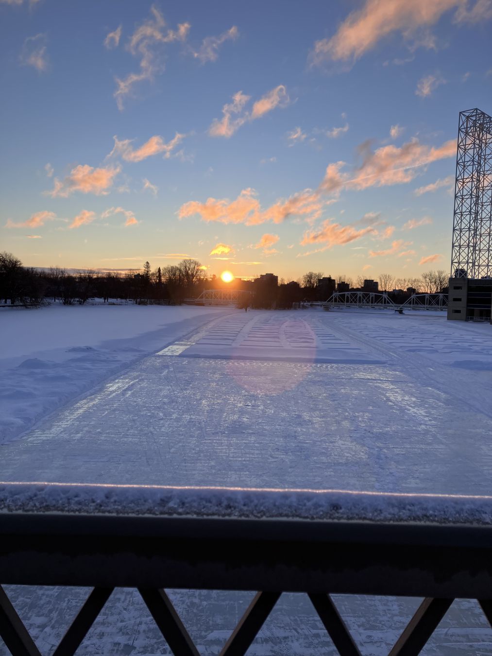 Viewed from the bridge on Sussex Drive looking south towards the Minto bridges as the sun came through the cityscape. The snow has been carved out in a familiar grid pattern to prepare doe blowing up the ice at some future point. Blue skies ahead! #February #Ottawa #RideauRiver #sunrise #photography #cityscapes