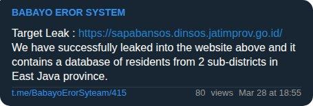 BABAYO EROR SYSTEM claims data breach on Indonesia's SAPA BANSOS. Leaked a database belonging to SAPA BANSOS. #DataBreach #Government #Indonesia #ThreatIntel