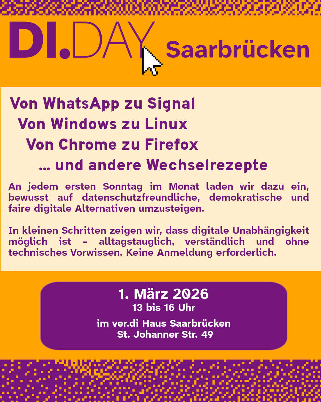 Nächsten Sonntag, 01.03.2026 #DID #diday in #Saarbrücken!An jedem ersten Sonntag im Monat laden wir dazu ein, bewusst auf datenschutzfreundliche, demokratische und faire digitale Alternativen umzusteigen.Termin: 01.03.2026 13:00 bis 16:00Ort: ver.di Haus Saarbrücken, St. Johanner Str. 49 (rotes Kreuz auf der Karte)Anreise: Saarbrücken Hauptbahnhof, dann 350m FußwegParken: - hinter dem Haus- unter der Westspangenbrücke- in der Hafenstraße am Kongress Zentrum - oder einen der vielen kleinen Parkplätze in der Umgebung (alle kostenpflichtig)Themen: - Unterstützung bei der Umstellung von Chrome auf Firefox und den anderen Wechselrezepten lt. https://di.day- Aufspielen von Linux Mint auf mitgebrachte Laptops- Smartphone WerbeIDs löschen, Tracking blocken etc https://33dbm.de/download/DigitalIndependenceDaySmartphones.pdf- zur Not auch W10 auf W11 Update für ältere Hardware Bitte sichert vorher Eure Daten wenn ins Betriebssystem eingegriffen werden soll.Kosten: keine Es gibt kein festes Programm, die Veranstaltung lebt von Euren Wünschen und Fragen.Gute Anreise!#DID #diday #google #ios #tracking