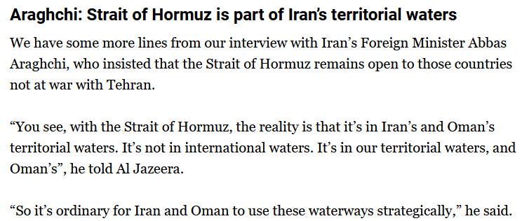 I was actually trying to find solid info on this yesterday, because I keep hearing the law of the sea being invoked regarding the closure of Hormuz.This is clearly not true (https://www.un.org/depts/los/nippon/unnff_programme_home/alumni/tokyo_alumni_presents_files/alum_tokyo_dehghani.pdf) as the Strait of Hormuz sits 50/50 in Omani and Iranian contiguous zones, and, tough luck for fascists, the shipping channels are in Iranian waters.The UN Convention on the Law of the Sea makes it clear in Article 33 (https://www.un.org/Depts/los/convention_agreements/texts/unclos/part2.htm1. In a zone contiguous to its territorial sea, described as the contiguous zone, the coastal State may exercise the control necessary to:(a) prevent infringement of its customs, fiscal, immigration or sanitary laws and regulations within its territory or territorial sea;(b) punish infringement of the above laws and regulations committed within its territory or territorial sea.#USpol #Israel #Iran