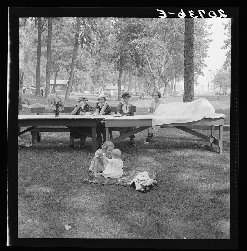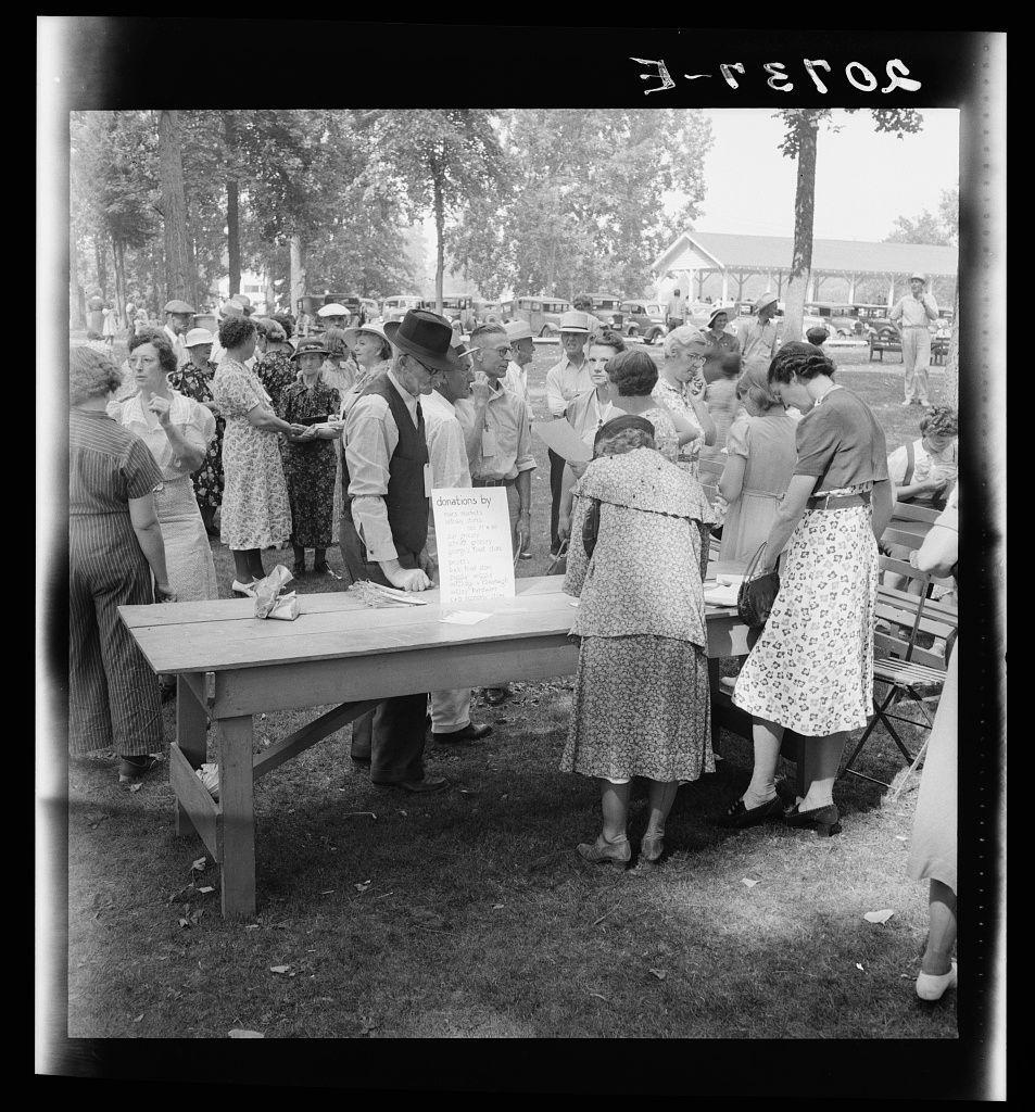 Hop picker with her children goes from paymaster's window to company-owned store adjoining.