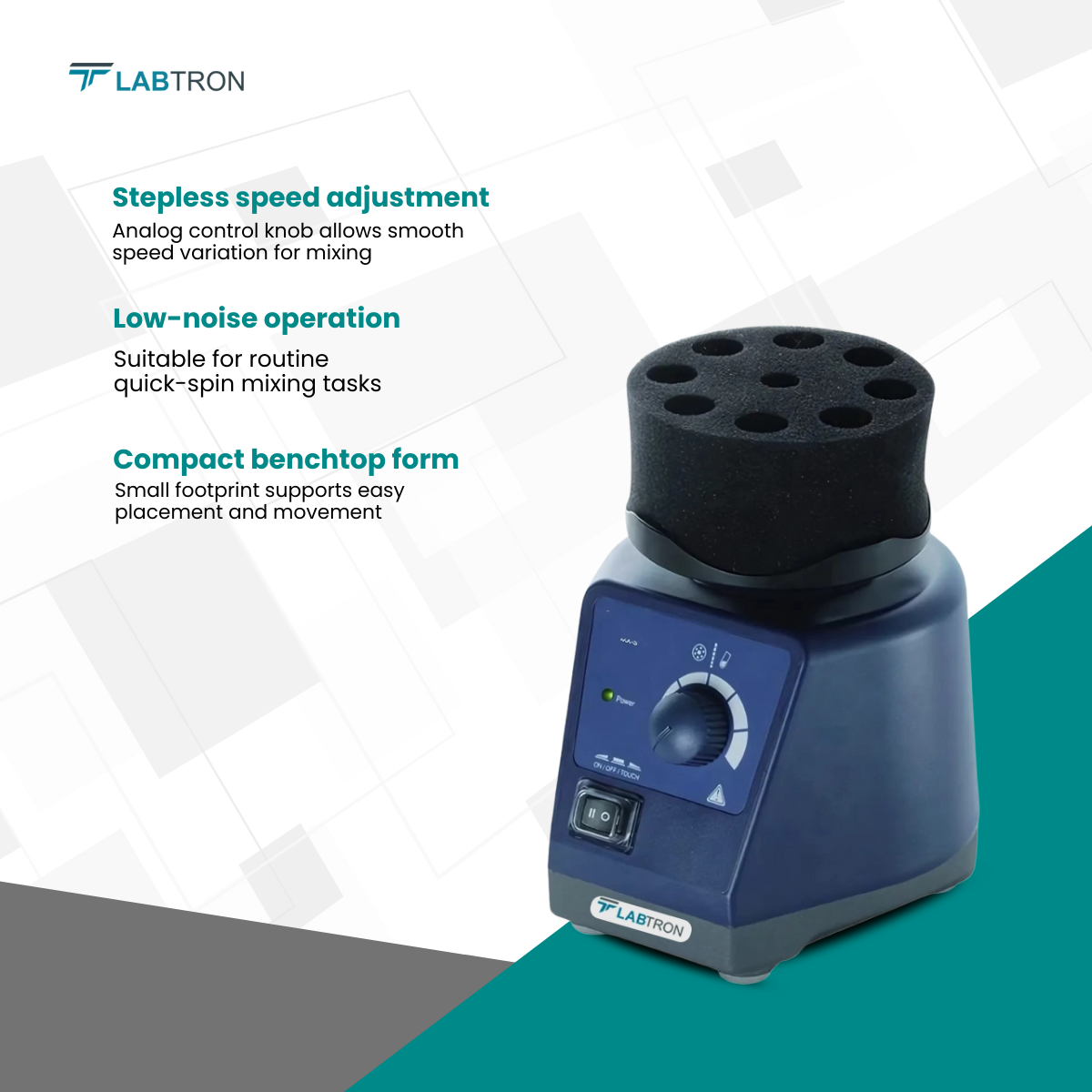 Vortex Mixer LVOM-A10 - Vortex ShakerLabtron Vortex Mixer is a compact and portable unit with adjustable speed to suit varied experimental needs. It features low noise operation and supports quick spin applications during routine lab work. Analog control with a stepless speed knob enables uniform and consistent sample mixing.#LabEquipment#Minivortexmeter#Labtron https://www.labtron.com/vortex-mixers/lvom-a10
