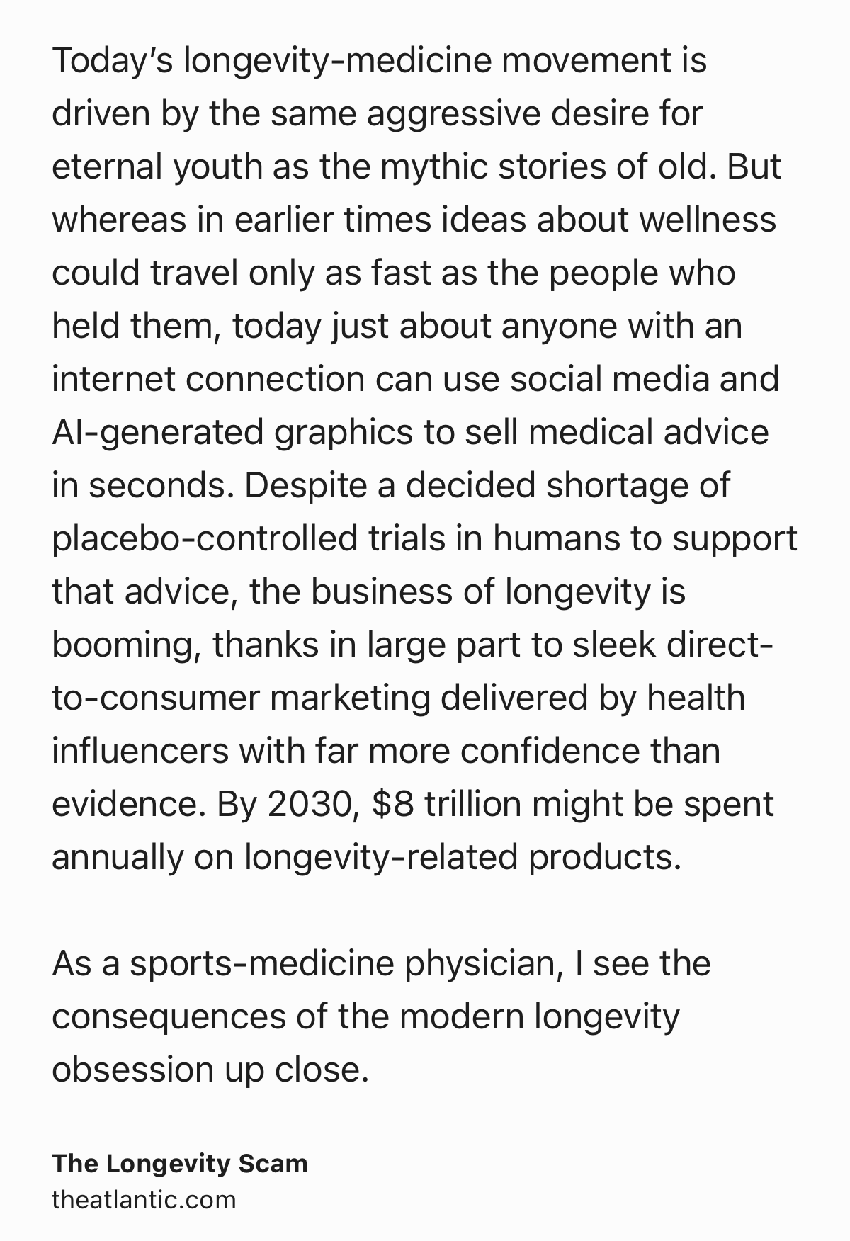 Are #Peptides like “#Wolverine” (#BPC157) Just a #Modern Snake Oil?The #Longevity Scam“The quest to live forever has fascinated humans for millennia. The Epic of Gilgamesh, composed about 4,000 years ago, follows a king who searches the world for a plant that can restore youth, only to lose the plant to a thieving snake. The (likely apocryphal) story of Juan Ponce de León, who is said to have embarked on a search for the Fountain of Youth in the early 16th century, refuses to die—unlike its protagonist, who was killed along his journey.”https://www.theatlantic.com/health/2026/02/longevity-medicine-profit-oversold/686049/
