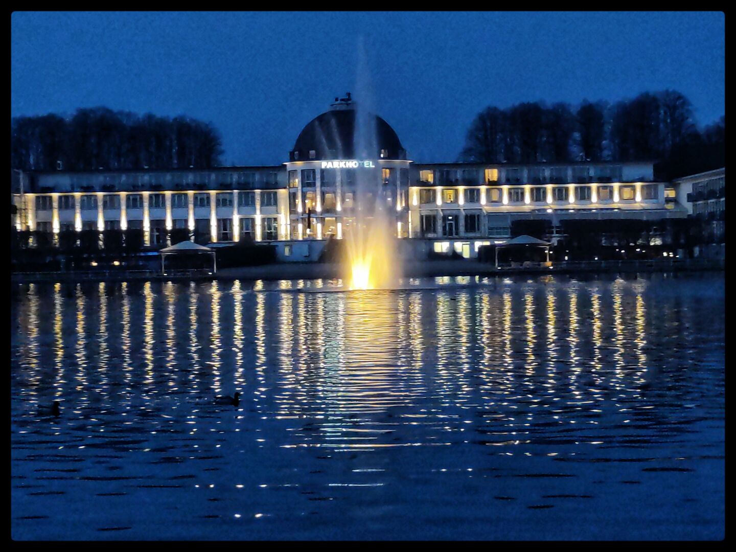 Evening settles over Bürgerpark Bremen as the lights of the Parkhotel Bremen reflect softly across the water.