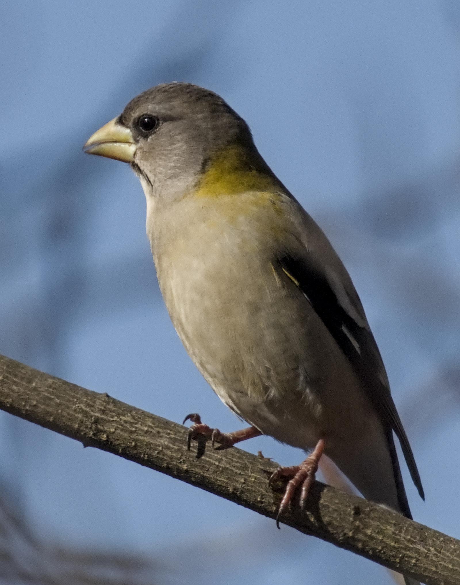 An apparently pensive female Evening Grosbeak from a flock that's been present in Groton, #Massachusetts for much of this winter.
