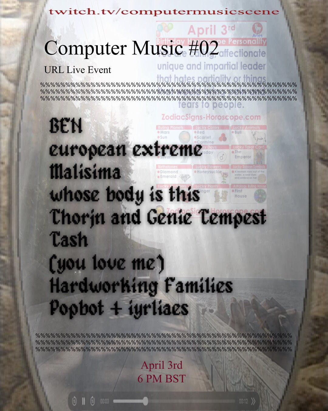 we are so excited to formally announce our second event, Computer Music 2! some new faces, some old faces, some good music to be played xx3rd of April, 6pm BST on Twitch#computermusic #algorave #supercollider #maxmsp #puredata #livestream
