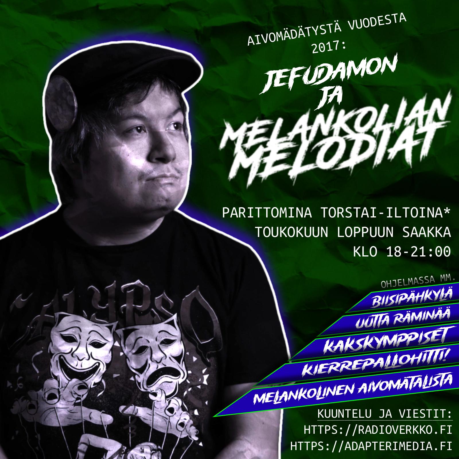 Kyllä, olen palannut radiontekemisen äärelle. Tänä vuonna Melankolisissa on vähän eri tuulet, kun teen ohjelmaa samanaikaisesti kahdelle kanavalle.Tämän lisäksi ohjelmassa on uusia osioita, kuten Biisipähkylä, jossa haetaan biisin esittäjää ja biisin nimeä enemmän tai vähemmän kryptisen vihjekokonaisuuden kautta. Tämä on yritykseni saada kuulijoita vähän aktivoitumaan viestien lähettämisessä.Toinen uusi osio on 2Kymppiset, jota luotsaan Miro Laaksosen kanssa. Osiossa käsitellään 20. juhlavuotta juhlivia levyjä.Aivomätälistalla annan huumorin ja musiikillisten traumojen puhutella. Alkuperäinen työnimi tälle ohjelmaosiolle oli Shittilista, koska pitäähän paskaakin soittaa.#MelankolianMelodiat