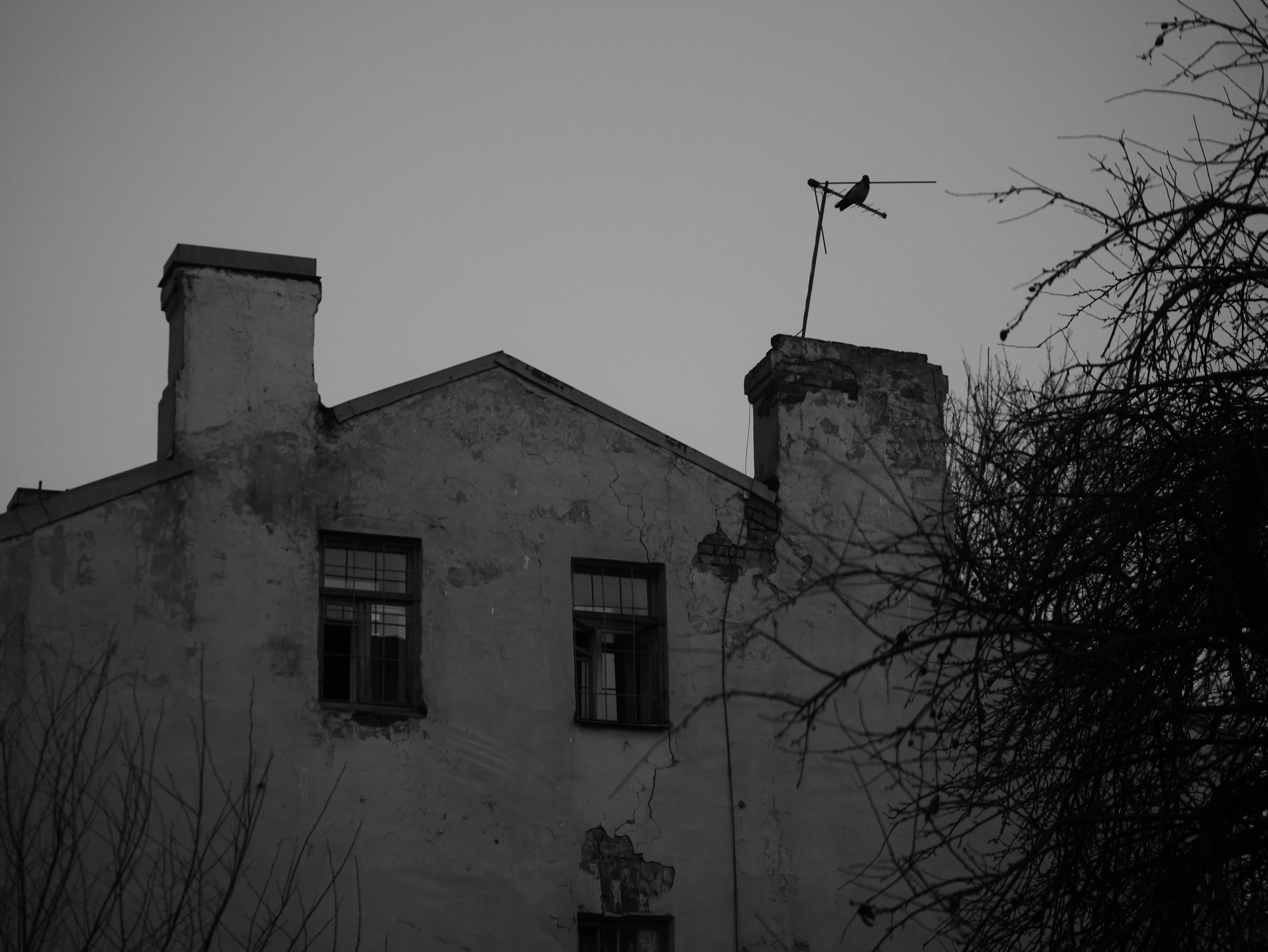 A blackbird sings behind an abandoned fire station and a crow sits on the trumpet.#blackandwhitephotos #monochromemarch