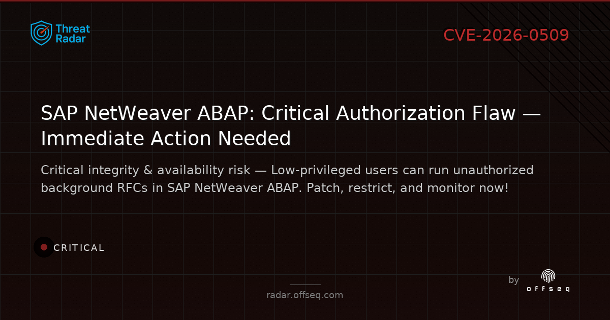 π‘οΈ CRITICAL: CVE-2026-0509 in SAP NetWeaver ABAP (7.22 β 9.19) lets authenticated users run unauthorized background RFCs, risking integrity & availability.
