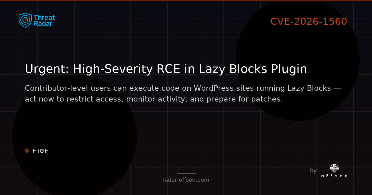 β οΈ HIGH severity: CVE-2026-1560 in Lazy Blocks (WordPress, β€4.2.0) lets Contributor+ users run arbitrary code via improper code generation (CWE-94).