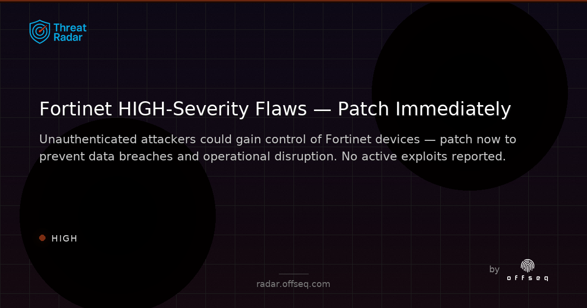 Fortinet released HIGH-severity patches for flaws enabling unauthenticated command execution & auth bypass on network devices.