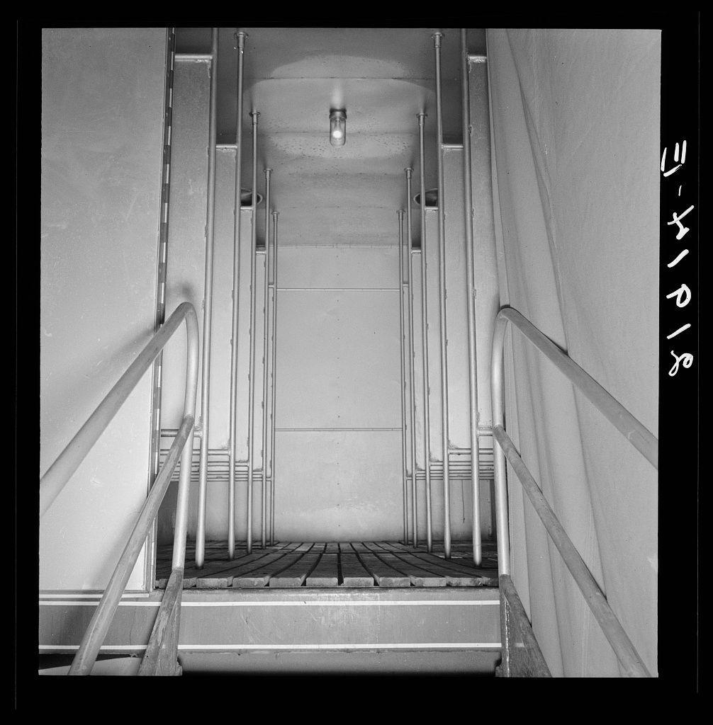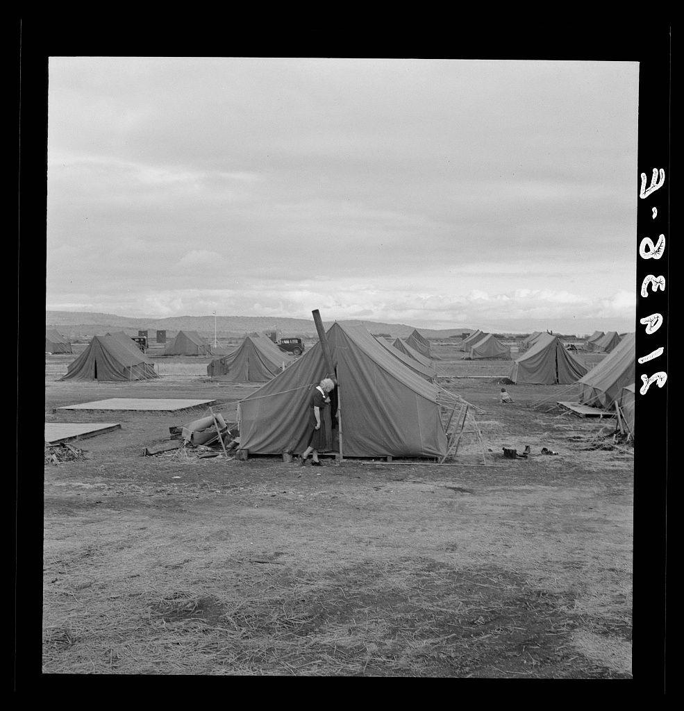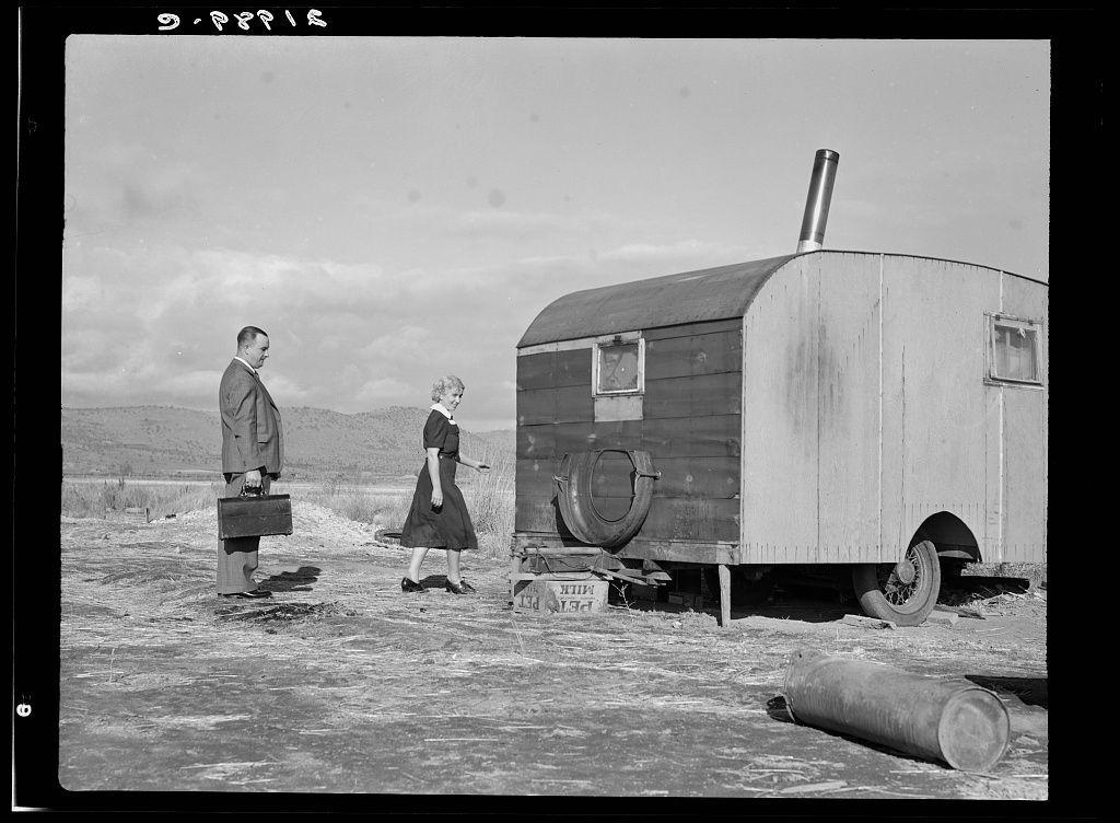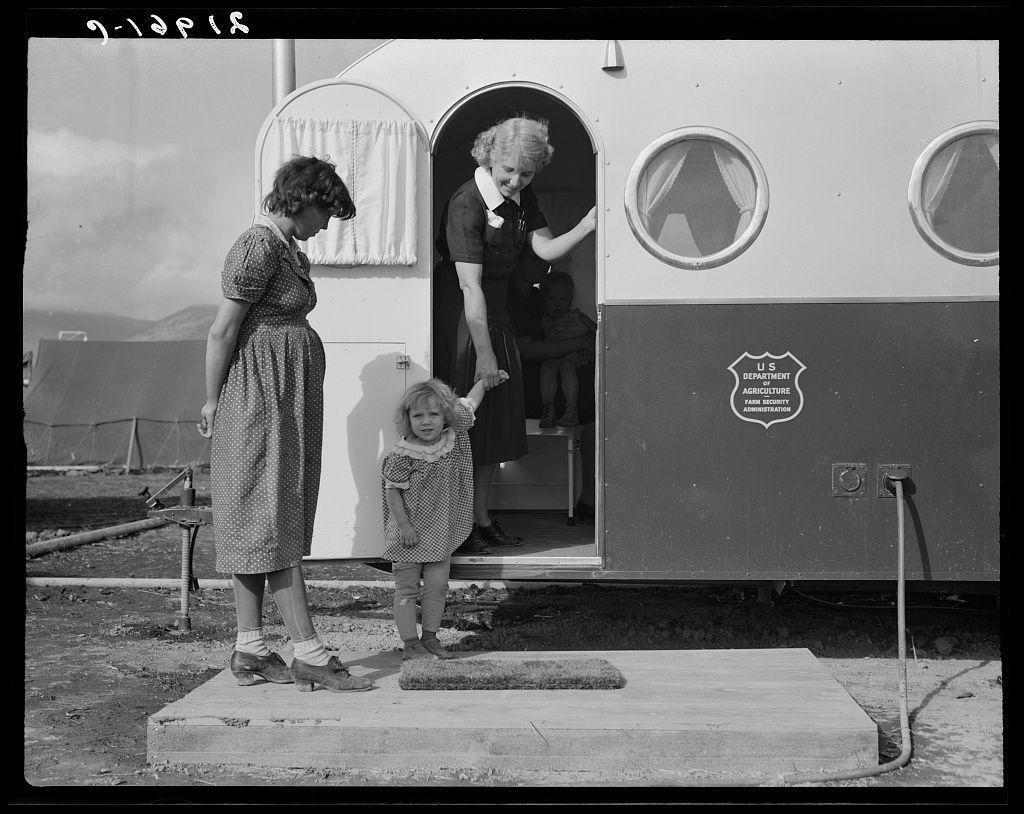 Nurse in FSA (Farm Security Administration) mobile camp unit conducts doctor to house trailer where there is a sick child.
