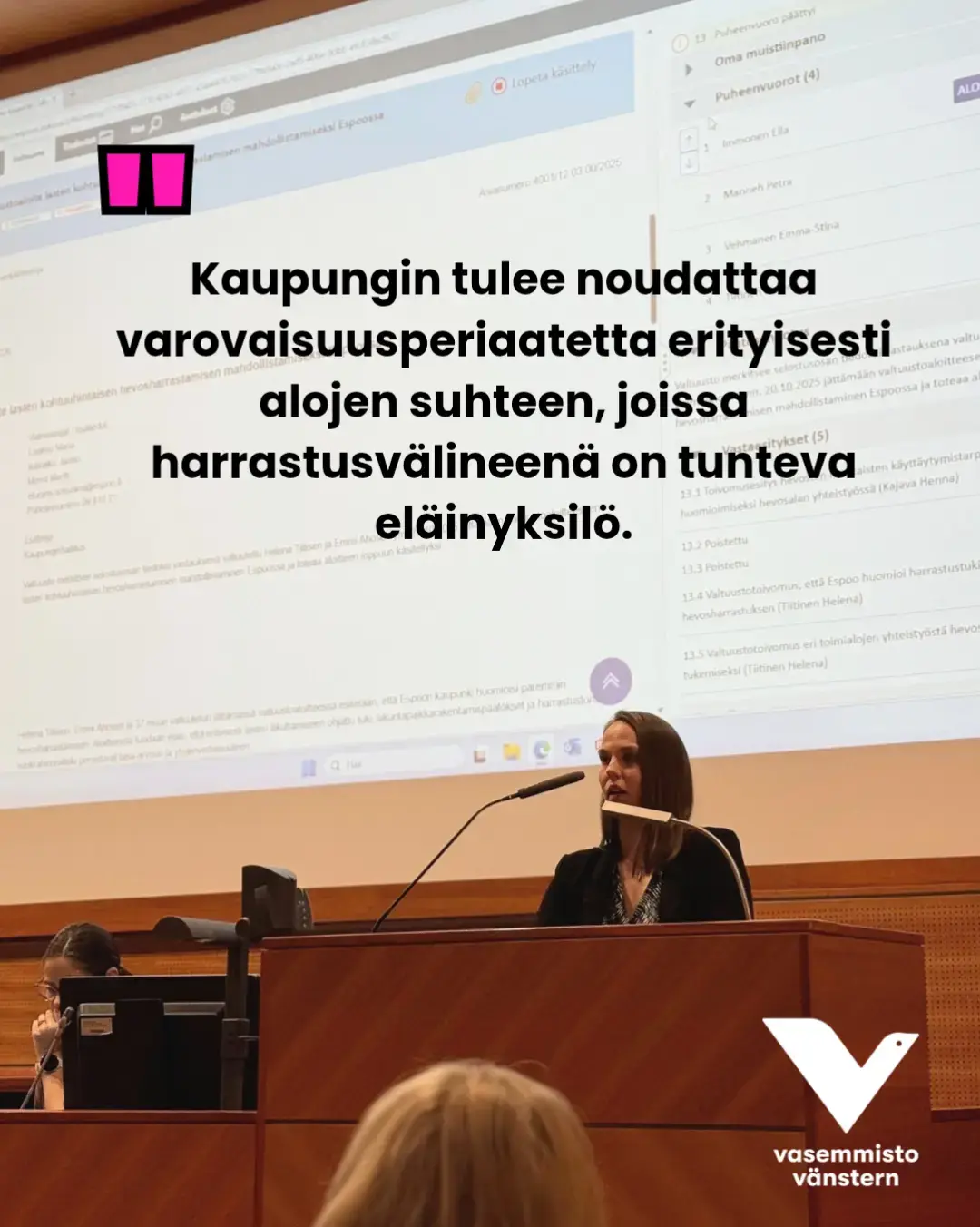 Maanantaina 23.3.2026 Espoon kaupunginvaltuuston kokouksessa käytiin keskustelua valtuustoaloitteesta lasten kohtuuhintaisen hevosharrastuksen mahdollistamiseksi. Pidin oheisen puheen."Arvoisa puheenjohtaja, hyvät valtuustokollegat ja muut kuulijatpidän sinällään ilahduttavana, että Espoossa on tahtotilaa esimerkiksi näin aloitteiden kautta pyrkiä edistämään kohtuuhintaista harrastamista.Haluan kuitenkin nostaa esiin ne, jotka ovat tämän aloitteen keskiössä, mutta kuitenkin siinä näkymättömissä, eli hevoset.Aloitan sanomalla, että olen maalta kotoisin, Etelä-Savosta, ja harrastanut hevosia aikoinani yli kymmenen vuotta. Yliopistossa opiskelin ympäristöpolitiikan oppiaineessa myös eläinpolitiikkaa ja sittemmin myös työskentelin eläinoikeuksien parissa.Hevosen rooli on yhteiskunnassamme mielenkiintoinen, se ei ole tuotantoeläin eikä lemmikkieläin. Hyöty- tai harraste-eläin kuvaa sitä ehkä parhaiten. Hevosella on yleensä aina välineellinen arvo, se on harrastusväline, joskus myös kilpailuväline.Ratsastus ei ole hevoselle luontaista. Sen yhteydessä eläimen kehoon kajotaan ja sitä kontrolloidaan erilaisilla välineillä. Ratsastuskouluolosuhteissa hevoset viettävät tunteja päivässä ratsastustunneilla, erilaisia ja eri tasoisia ratsastajia kantaen.Hevosalaa varjostaa myös pimeämpi puoli.European Equine Welfare Association ry toteutti vuonna 2021 kyselyn siitä, miten alalla toimivat ammattilaiset ja harrastajat näkevät tai kokevat hevosiin kohdistuvan voimankäytön tai väkivallan. Kyselytutkimukseen vastasi 1300 suomalaista. Kartoituksesta selvisi tuolloin, että 85 prosenttia kyselyyn vastanneista on nähnyt hevoseen kohdistuvaa väkivaltaa Suomessa edellisen viiden vuoden aikana. 59 prosenttia sanoo käyttäneensä voimakeinoja hevosta kohtaan samalta aikaväliltä. 72 prosenttia paljasti, että heitä on kehotettu käyttämään voimakeinoja hevosia kohtaan.Uusi asetus hevosten hyvinvoinnista tuli voimaan tämän vuoden alusta. Asetus toi joitain parannuksia hevosten elinolosuhteisiin. Surullisen kuvaavaa on, että hevosalan etujärjestöt vastustivat asetusuudistusta, koska se tuo alalle kustannuksia.Tarkoitus ei tässä ole luoda hyvä-paha-asetelmia, vaan tarkastella toimintaa eläimen näkökulmasta ja moraaliselta kannalta. Mielestäni kaupungin tulee noudattaa varovaisuusperiaatetta erityisesti alojen suhteen, joissa harrastusvälineenä on tunteva eläinyksilö - eli kun on syytä epäillä kielteisiä vaikutuksia eläinten hyvinvointiin, pyrimme ehkäisemään niitä, vaikka täyttä varmuutta hevosen mielipiteestä asiaan ei kenties voida koskaan saada. Kiitos."Tuin Henna Kajavan (ps.) toivomusesitystä, joka kuuluu seuraavasti: "Valtuusto toivoo, että kaupunki huomioi Espoo-tarinassa mainitun eläinten hyvinvoinnin edistämisen toimiessaan yhteistyössä hevosalan yrittäjien kanssa ja edellyttää hevosten luontaisten käyttäytymistarpeiden toteutumista hevosten sekä fyysistä että psyykkistä terveyttä tukevalla tavalla." Ilahduttavasti toivomus hyväksyttiin yksimielisesti. On hienoa, että Espoossa on tahtotilaa eläinten hyvinvoinnin parantamiseksi. Kyseinen kirjaus Espoo-tarinaan oli Vasemmiston ryhmän vahvasti ajama tavoite. Aloitevastauksessa todetaan, että resursseja esim. kaupungin omalle hevostallille ei ole. Vastustin toivomusesityksiä, joissa toivottiin hevosharrastuksen tukemista. Ne hyväksyttiin äänestysten jälkeen.#espoo #espoonvasemmisto #vasemmisto #vasemmistoliitto #politiikka #kuntapolitiikka #eläinoikeudet #hevoset #ratsastus