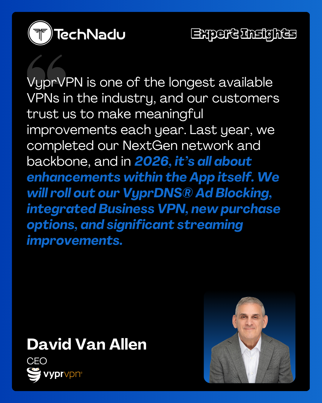 VyprVPN shares its 2026 roadmap - focusing on app enhancements, privacy-first infrastructure, and improvements to the Chameleon protocol.In TechNadu’s interview with David VanAllen:“VyprVPN is one of the longest available VPNs in the industry, and our customers trust us to make meaningful improvements each year. Last year, we completed our NextGen network and backbone, and in 2026, it’s all about enhancements within the App itself.”Key updates include VyprDNS Ad Blocking, Business VPN integration, and streaming performance upgrades.Full interview:https://www.technadu.com/vyprvpn-on-app-enhancements-chameleon-protocol-and-privacy-first-vpn-features/622336/#VPN #Privacy #CyberSecurity #Infosec