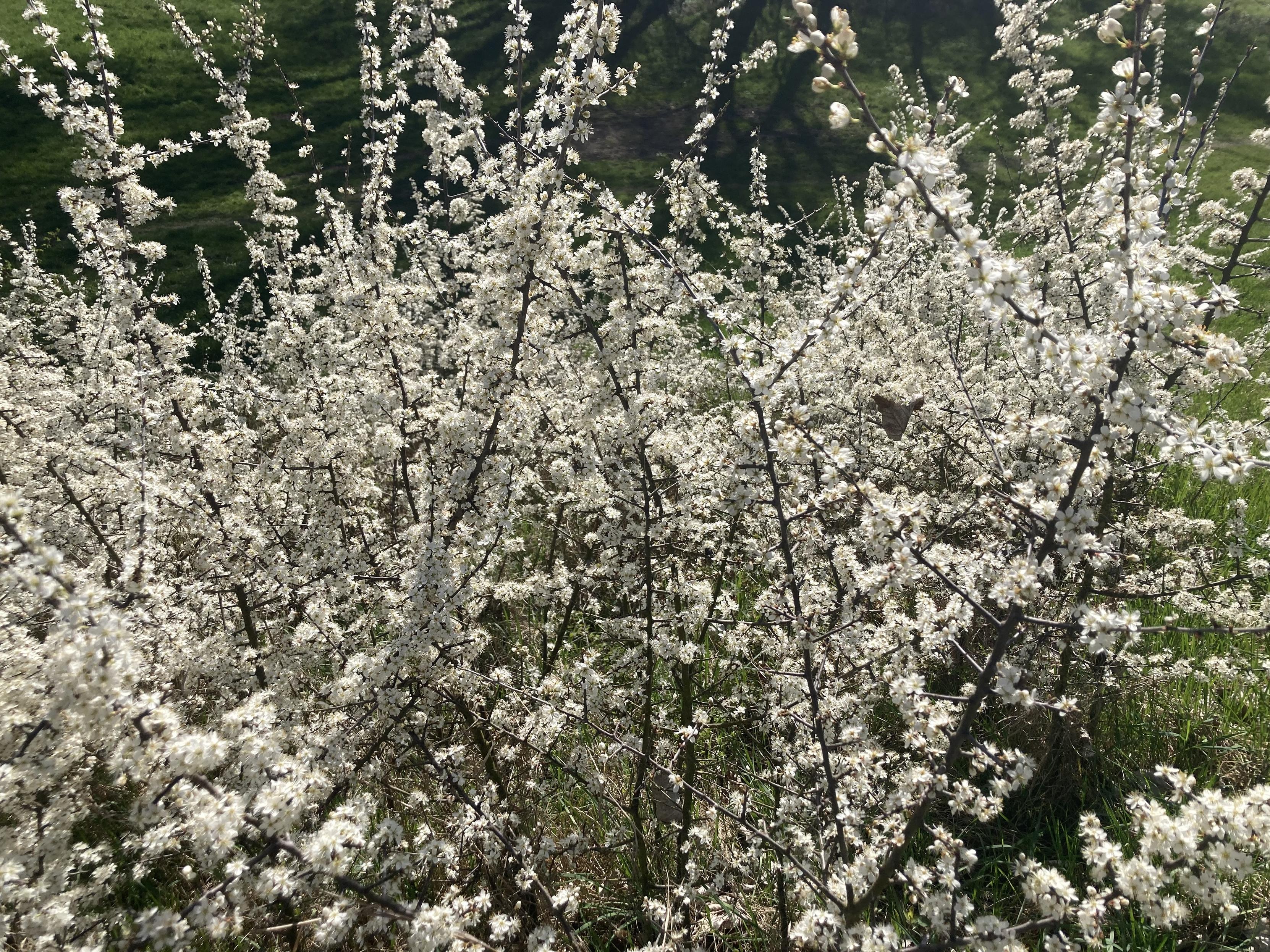 Hm, die Blüten waren mir am Montag nicht aufgefallen, und das Grün kommt auch langsam aus der Knospe.