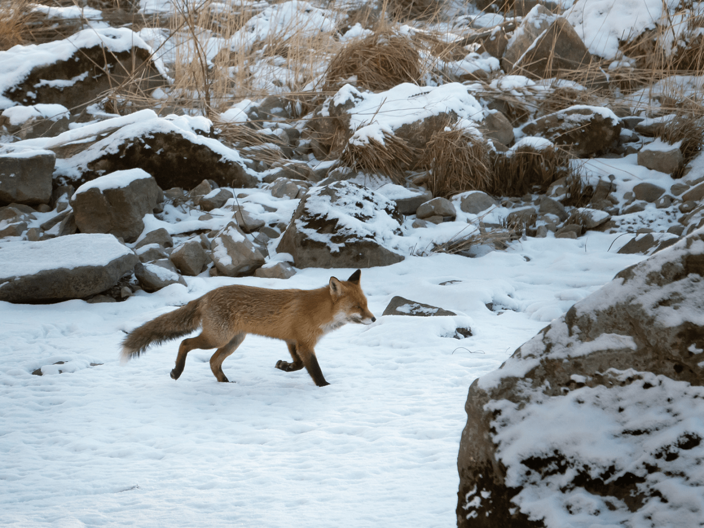 At the feeding places of white-throated dippers, you can see a lot of fox tracks on the edges of the ice, and here is one of their makers. Foxes are omnivores, and in addition to birds, there are rodents and mustelids (weasels, stoats, minks) that can be hunted by the waters. The white-throated dippers are still there.