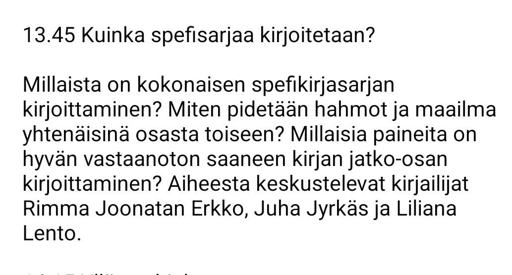 Taas mennään!Olen esiintymässä Spefistisillä kirjamessuilla lauantaina 14. maaliskuuta Pasilan kirjastossa.Tapahtuma on osa Helsingin kirjastojen järjestämää Maagista viikkoa.Ohjelmani:13.00 Jumalaa leikkimässäFantasiamaailman rakentaminen on kovaa puuhaa. Toiset rakentavat pieteetillä pientäkin yksityiskohtaa myöten, toiset antavat vain pieniä makupaloja. Millaisia rajoja joudutaan vetämään? Mistä ideat? Millaisiin sudenkuoppiin on vaarassa tuuskahtaaKeskustelemassa kirjailijat S. K. Rostedt, Hanna Morre, Eve Lumerto ja Venla Lintunen.15.15 Faktat ja realismi spefissäVoiko fantasiamaailma olla ”realistinen”, ja mitä se edes voi tarkoittaa? Missä määrin vaihtoehtohistorian kirjoittajan pitää olla uskollinen oikealle historialle? Kahlitseeko faktantarkistus mielikuvitusta?Keskustelemassa kirjailijat Frida Burns, Rimma Joonatan Erkko, Artemis Kelosaari ja Hanna Morre.Olen paikalla koko messujen ajan, joten tule ihmeessä juttelemaan. Maankutsujaa on tietysti ostettavissa Osuuskumman myyntipöydästä.Nähdään siis ensi lauantaina!#kirjamastodon #spefistisetkirjamessut #kirjailijanelamaa