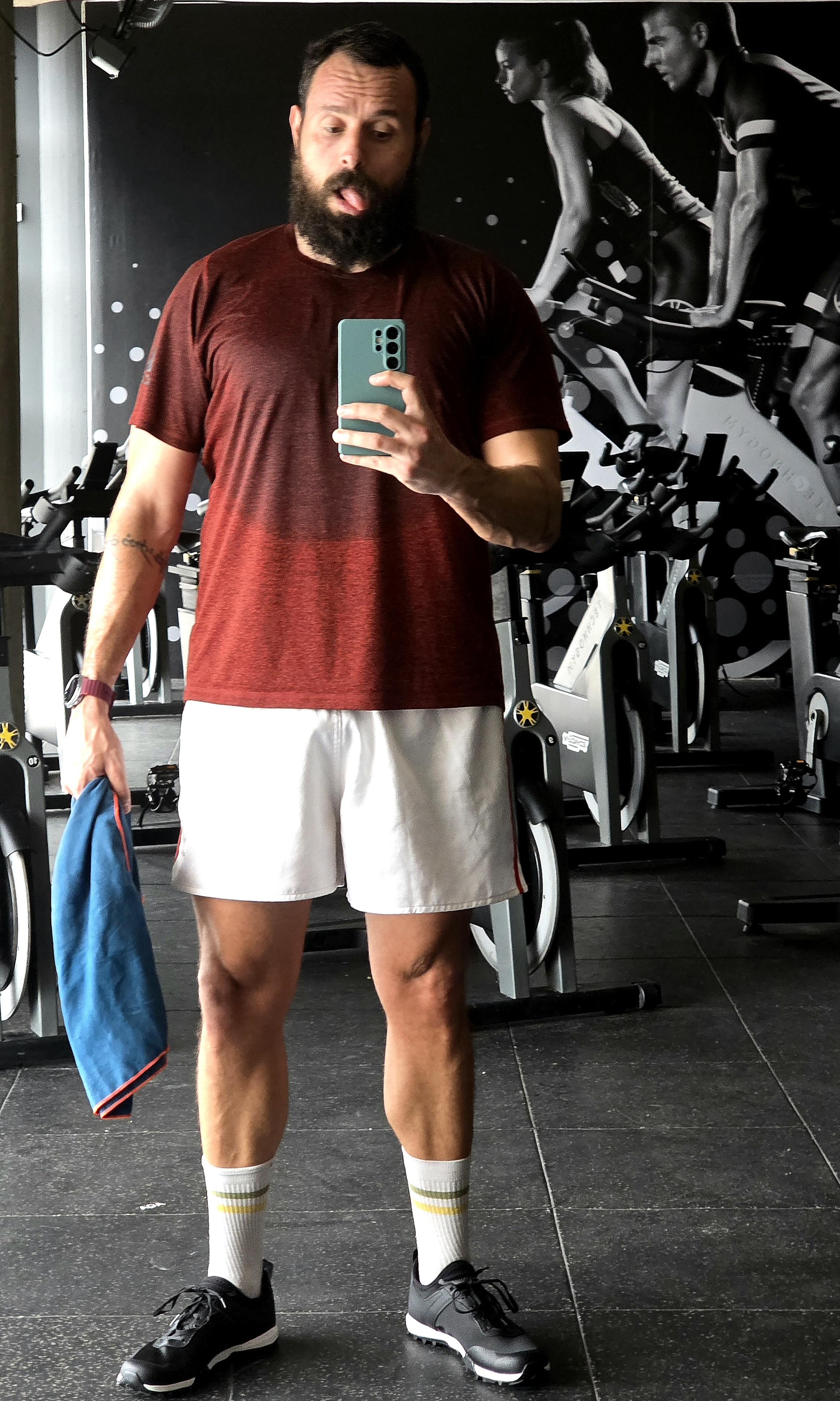 @muiiio A man with a full dark beard and dark hair takes a mirror selfie in a gym, playfully sticking his tongue out. He is wearing a reddish-brown athletic t-shirt and white athletic shorts. On his feet are white crew socks with yellow and green stripes, and black athletic shoes. He holds a light blue smartphone in his right hand, angled to take the photo, and a folded blue towel with an orange trim in his left hand. A watch with a reddish-purple band is visible on his left wrist.In the background, rows of black and grey spin bikes are visible on a dark, tiled gym floor. Behind the bikes, a large black and white mural on the wall depicts a man and a woman actively cycling on stationary bikes, surrounded by abstract white dot patterns.