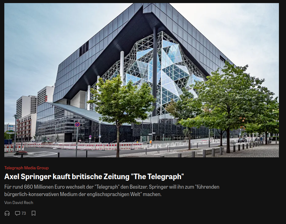 Das sind sehr schlechte Nachrichten: "The Telegraph" war vorher schon rechts. Nach der Übernahme durch #springer wird es noch schlimmer kommen."Springer will ihn zum "führenden bürgerlich-konservativen Medium der englischsprachigen Welt" machen."Das #Foxnews für das Englischsprachige Europa.#Springer gehört zerschlagen. Und schnell. Die sind eine große Gefahr für die Demokratie.Quelle: https://www.zeit.de/feuilleton/2026-03/the-telegraph-tageszeitnug-grossbritannien-axel-springer-kauf-gxe