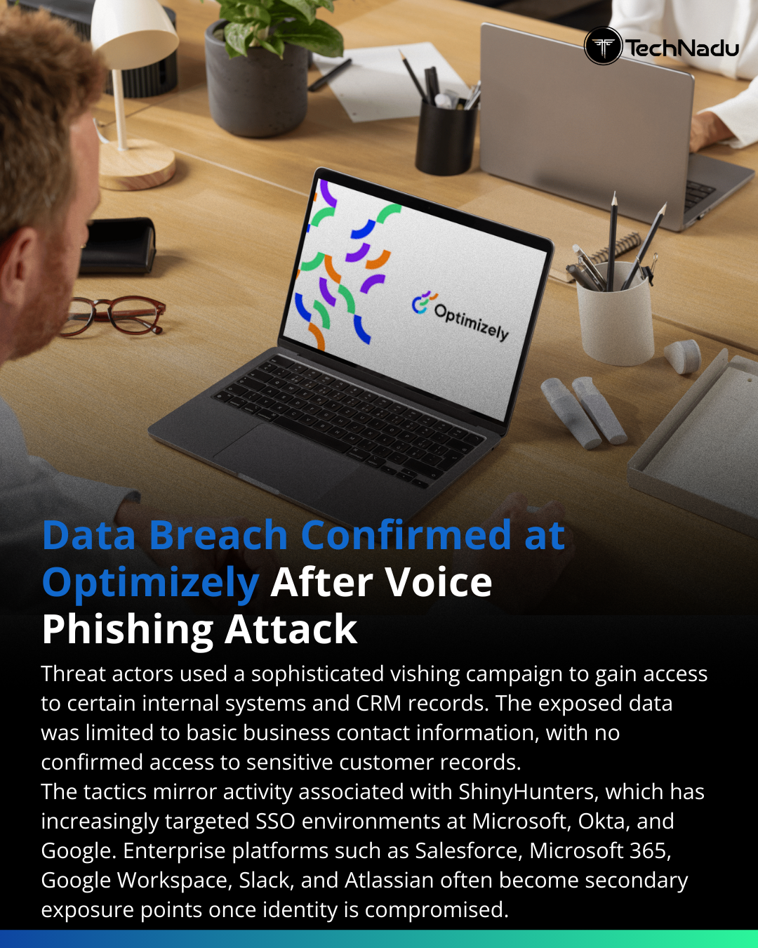 Vishing-Based Compromise at Optimizely Highlights Identity RiskAttackers gained access via voice phishing, targeting SSO-linked systems and CRM records. No confirmed privilege escalation, but exposure of business contact data reinforces how social engineering bypasses perimeter defenses.Activity patterns resemble ShinyHunters campaigns abusing MFA prompts and OAuth 2.0 device authorization flows.Common post-access targets include Salesforce, Microsoft 365, Google Workspace, Slack, SAP, Atlassian - wherever SSO tokens provide lateral access.Identity is the control plane. Once tokens are compromised, downstream exposure scales quickly.Is your organization monitoring abnormal device code authentication and token issuance events?Source: https://www.bleepingcomputer.com/news/security/ad-tech-firm-optimizely-confirms-data-breach-after-vishing-attack/Engage below.Follow @technadu for actionable threat intelligence.#Infosec #Vishing #OAuth #IAM #SSO #ZeroTrust #ThreatHunting #SOC #IdentitySecurity #CyberRisk