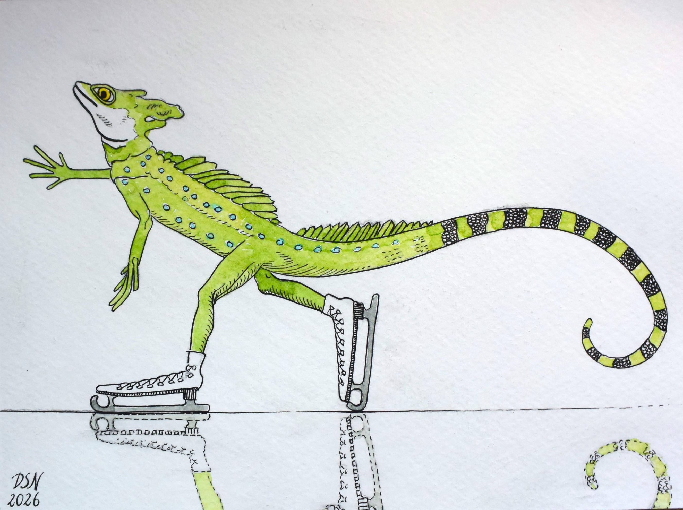 #art #illustration #animalmarch #kleinekunstklasse #surrealism #stirnlappenbasilisk #jesusechseIm Winter steigt der Stirnlappenbasilisk in seine Schlittschuhe und läuft damit übers Wasser.