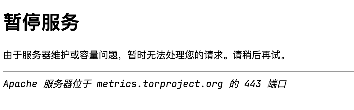 emmm,想查下我的tor relay贡献,碰上了维护...最近维护真多https://metrics.torproject.org暂停服务由于服务器维护或容量问题,暂时无法处理您的请求。请稍后再试。Apache 服务器位于 metrics.torproject.org 的 443 端口