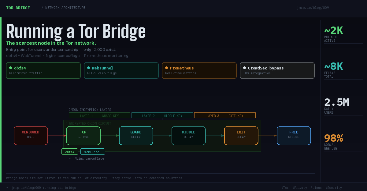 New post: how to run a Tor Bridge on Linux 🧅 — obfs4 + WebTunnel,Nginx camouflage, Prometheus & CrowdSec bypass.