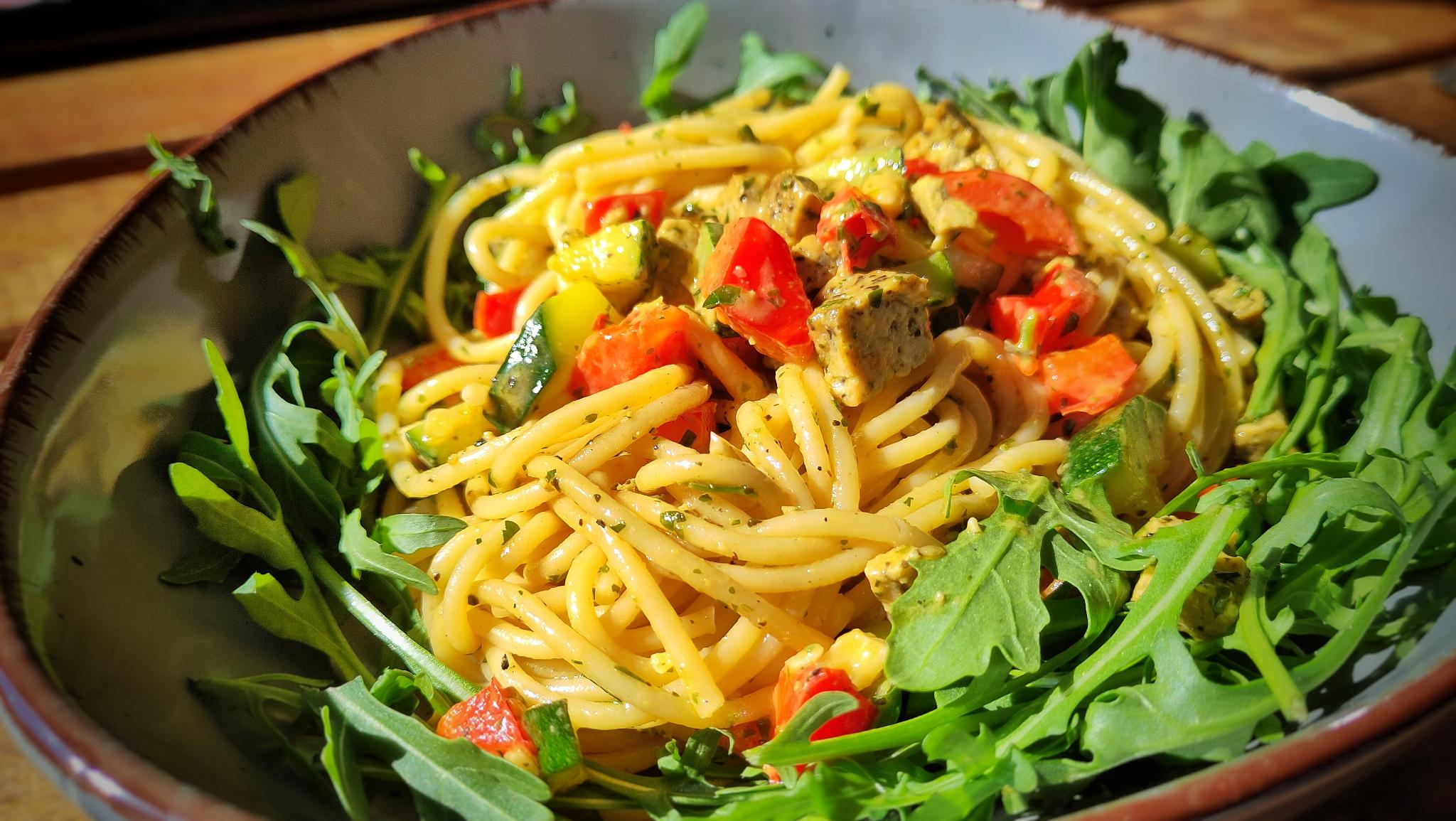 Rossmann-Tofu Tag 2: Cremige Pasta mit Knoblauch, Paprika, Zucchini und "Tofu Basilkum", serviert auf Unkraut.