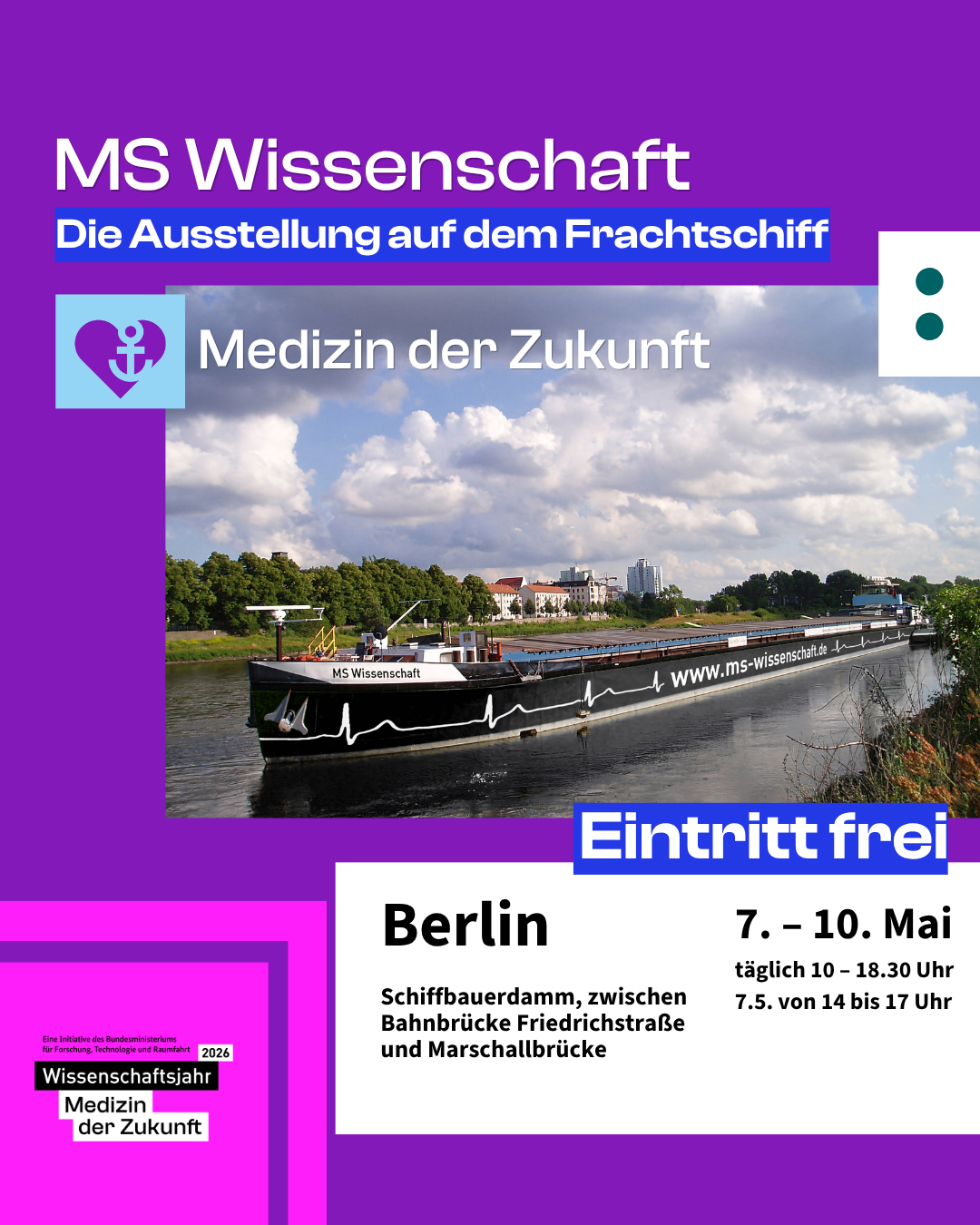 Leinen los für die MS Wissenschaft: Am 7. Mai 2026 eröffnen wir in Berlin feierlich die neue Ausstellung an Bord im Wissenschaftsjahr 2026 – Medizin der Zukunft. Von Berlin aus steuert das Ausstellungsschiff zwischen Mai und September 36 große und kleine Städte in Deutschland, Polen und Österreich an. Wir freuen uns auf die Tour und euren Besuch!@wissenschaftsjahr @bmftr_bund #Wisskomm #Wissenschaft #Forschung #Medizin