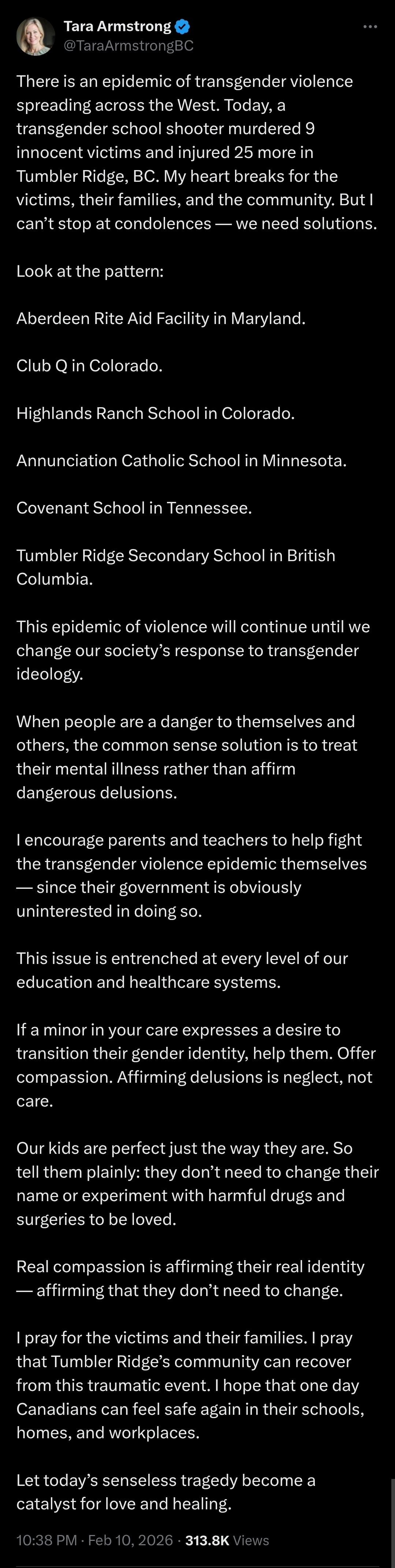 On the US side, where mass shootings occur much more regularly and give us much more data to work with, they account for less than 1/10th of a single percent. Transgender people account for about 1% of the US, meaning that their share of mass shooters is 1/10th of their representation in the population. Meanwhile, cis men account for nearly half the population of the US, while representing 97% of the mass shooters.Yet MapleMAGA politicians in Canada are claiming a supposed "epedemic" of transgender mass shooters, citing 5 cases, compared to the over 4,000 cases committed by cis men, as an "epidemic".