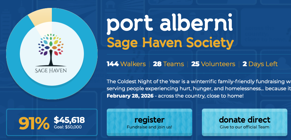 I believe in Sage Haven’s mission, and know the folks there and see the help they bring for people in #PortAlberni fleeing domestic violence. I'm also doing it in loving memory of my friend and their former lead, Ellen Frood.